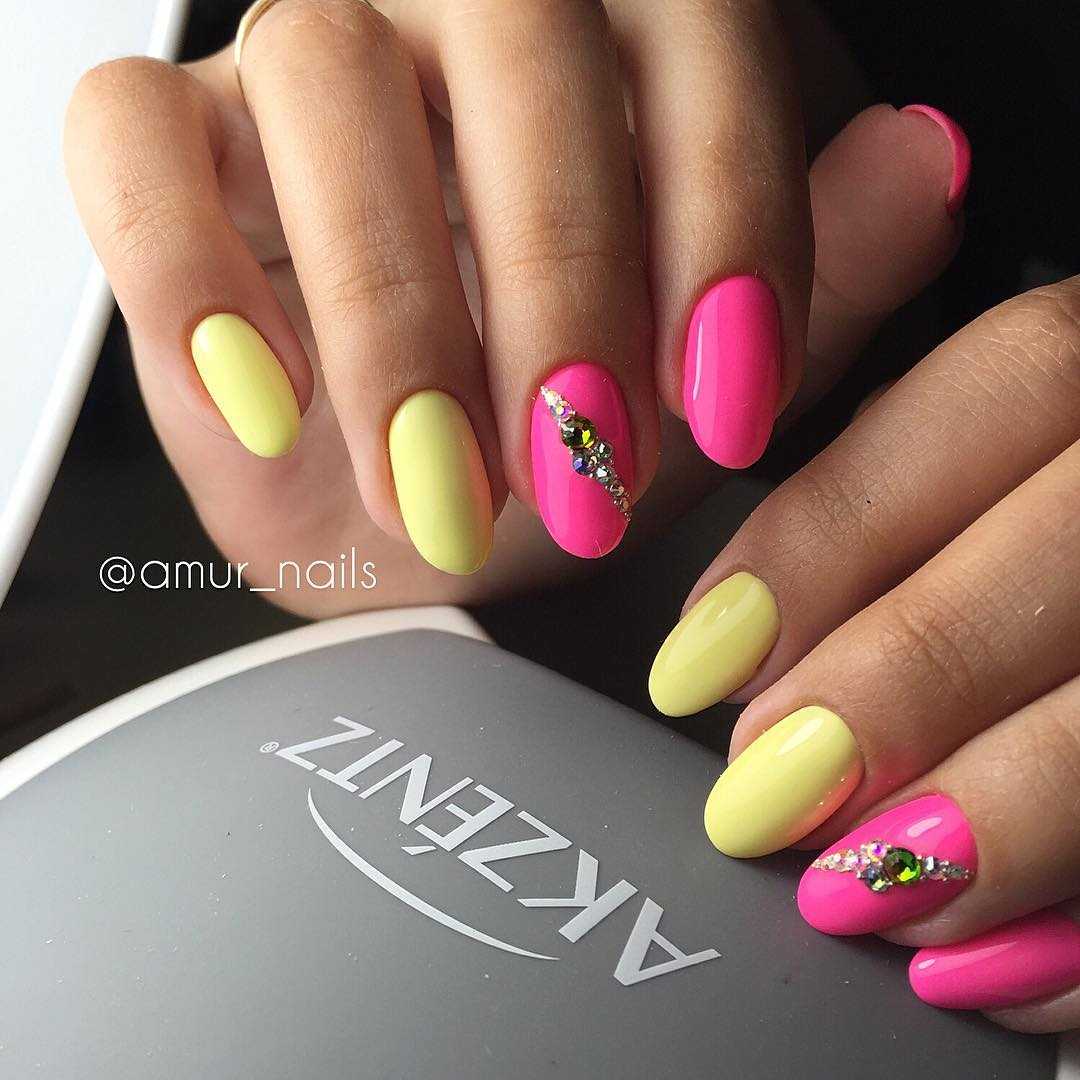 Весной – летом маникюр выполняют в ярких оттенках. Эффектно смотрятся белые вставки на ярком цвете. Яркий дизайн в теплое время года актуален, но гармоничное исполнение и баланс в игре цветов, красок требуется.