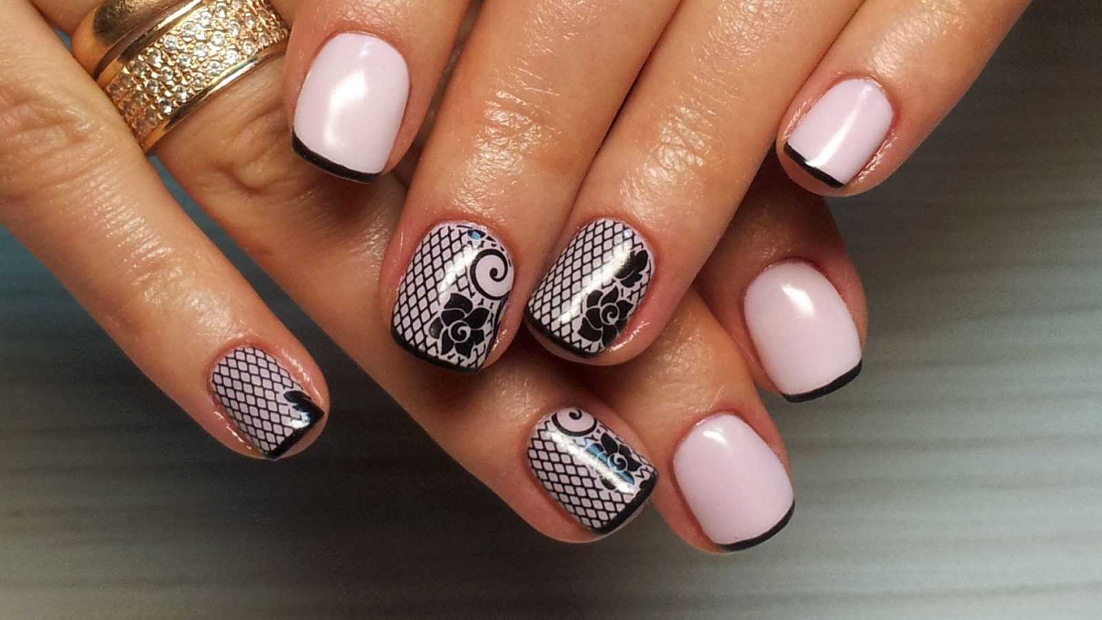 Аккуратный, эффектный и быстрый дизайн можно сделать, используя наклейки, переводные картинки или штампы. Интересный вариант представлен на изображении: