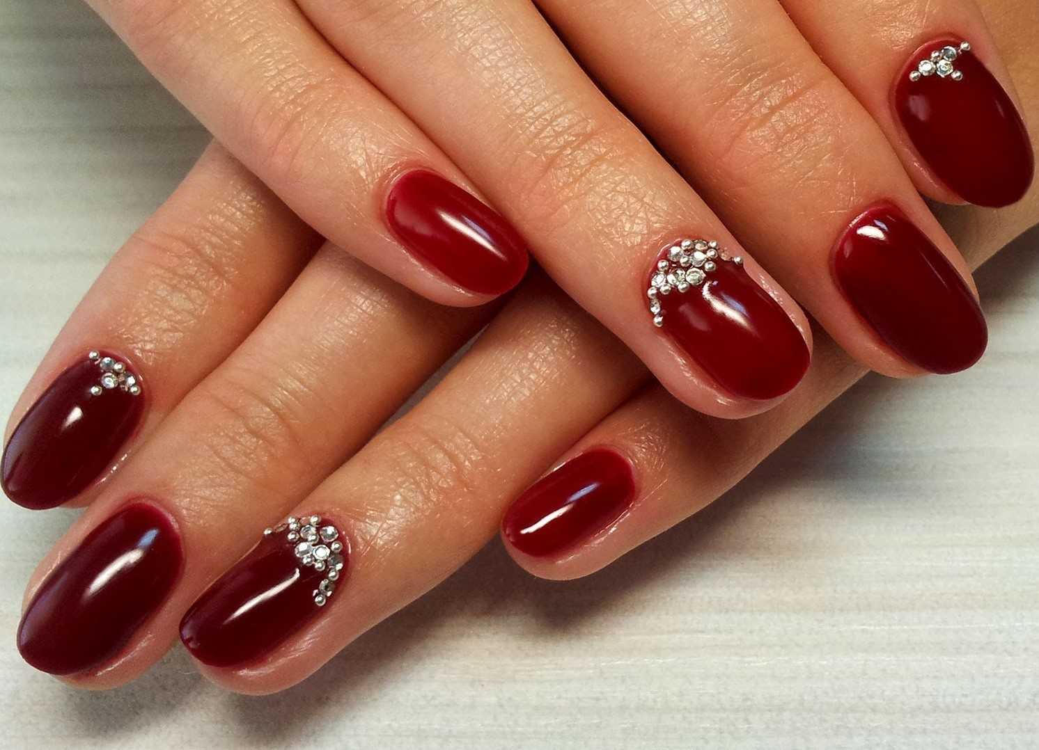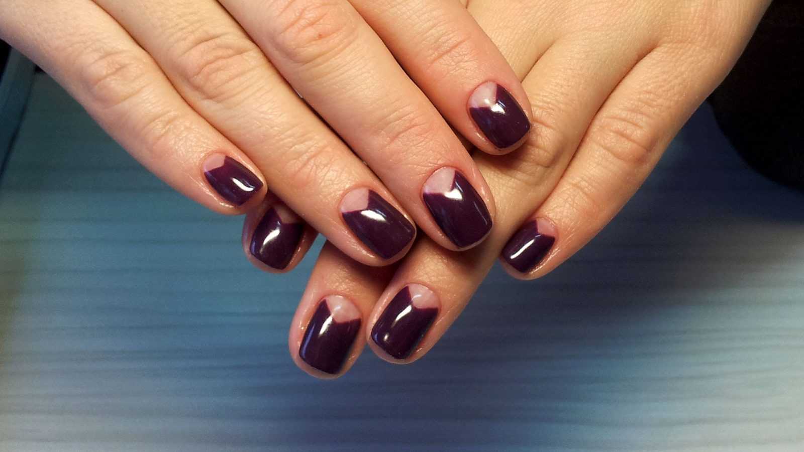 - Бордово-коричневый цвет. Такое покрытие одним цветом нельзя назвать эффектным. Для преображения маникюра требуется разбавление. Рекомендуются следующие оттенки: бордо, багрянец, винный, сливовый.