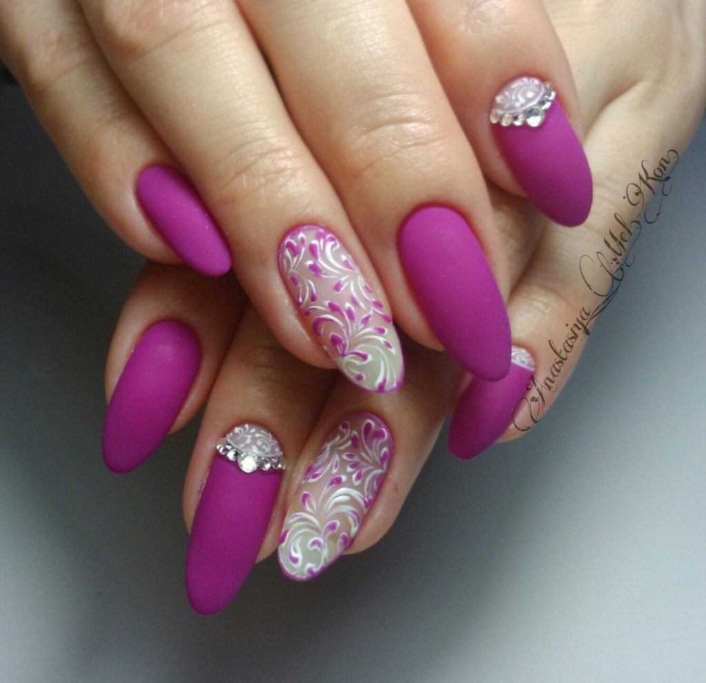Выбирать красивые однотонные оттенки посветлее для коротких, и более бархатные для длинных. Достаточно интересно может смотреться в матовом варианте. Отлично однотонный дополняется узором со строгими геометрическими формами или цветочными мотивами.