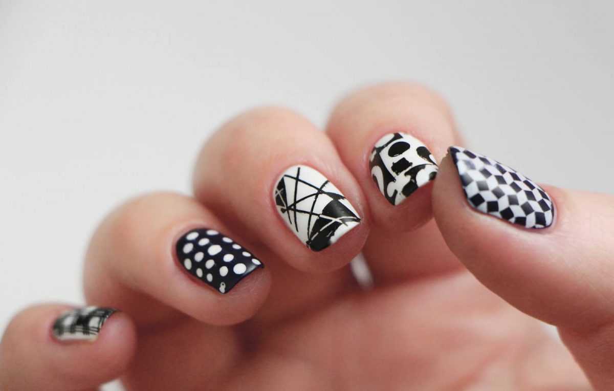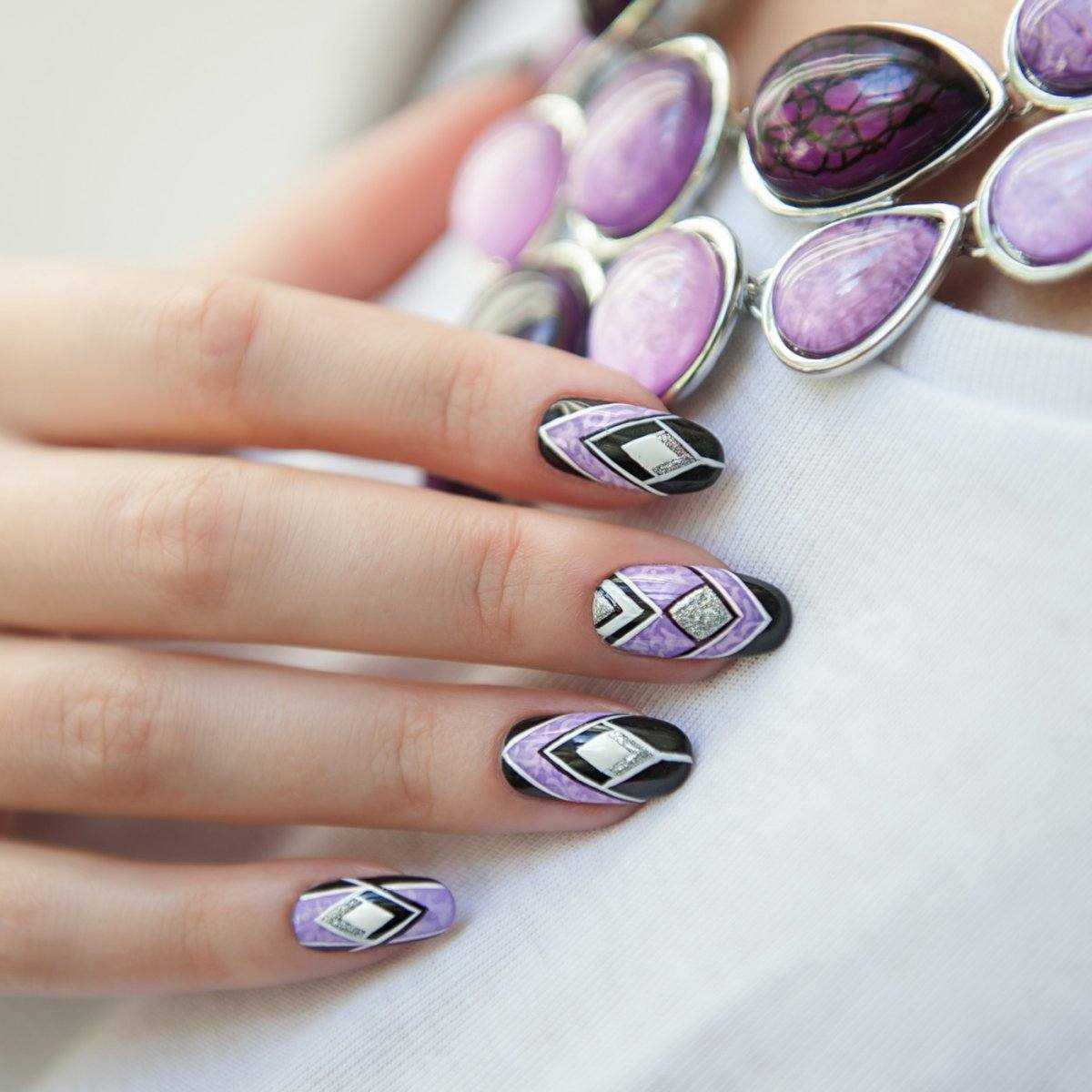 Дополнить оттеночную гамму можно как декорацией, так и орнаментом или рисунком. Чтобы выглядеть актуально, достаточно нарисовать полосы, расположенные хаотично. А также можно нанести на матовую лаковую поверхность глянцевый рисунок в виде спирали, капель или усложненный геометрический орнамент.