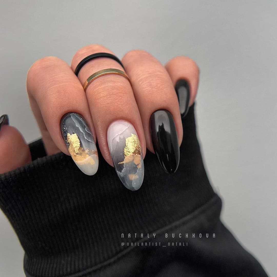 Подчеркнуть мраморный маникюр можно с помощью глиттера или тонких полос из фольги.