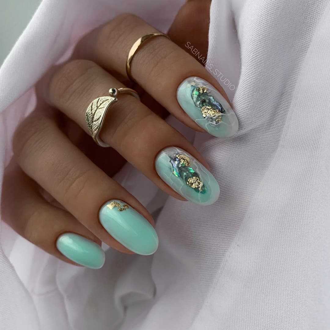 Узоры натуральных камней на ногтях можно дополнять и другими эффектами. Эта техника гармонично смотрится по соседству с матовыми ногтями, лунным маникюром, френчем.