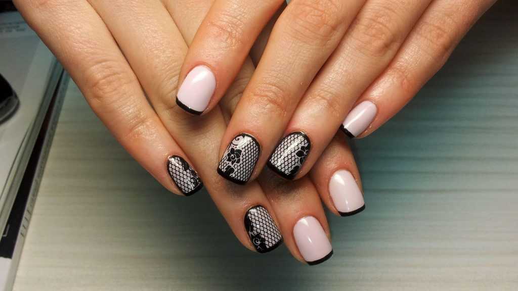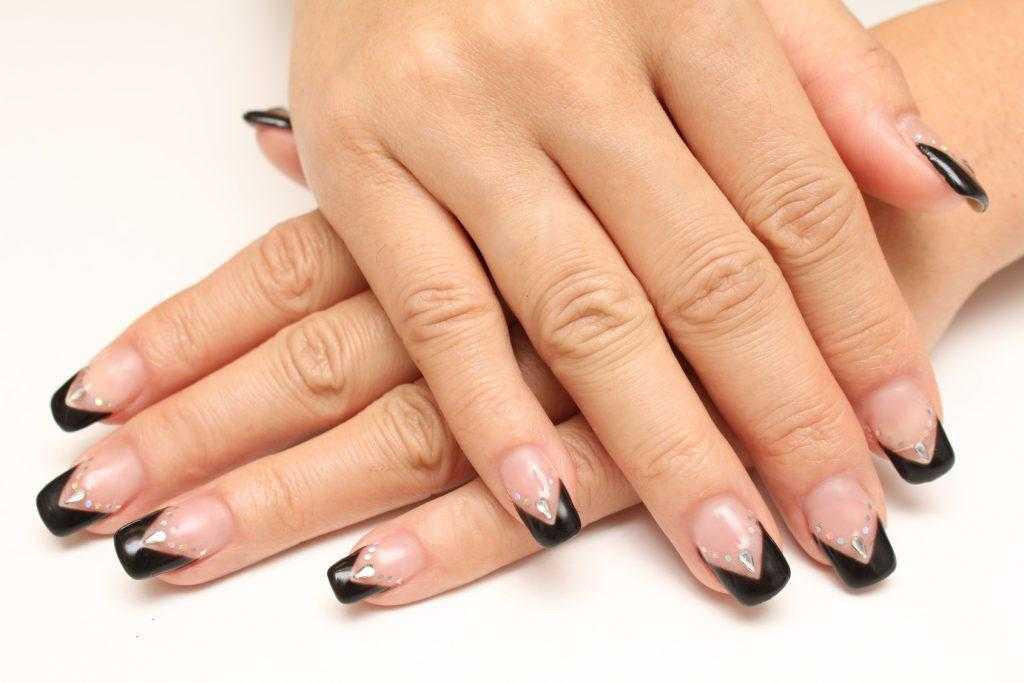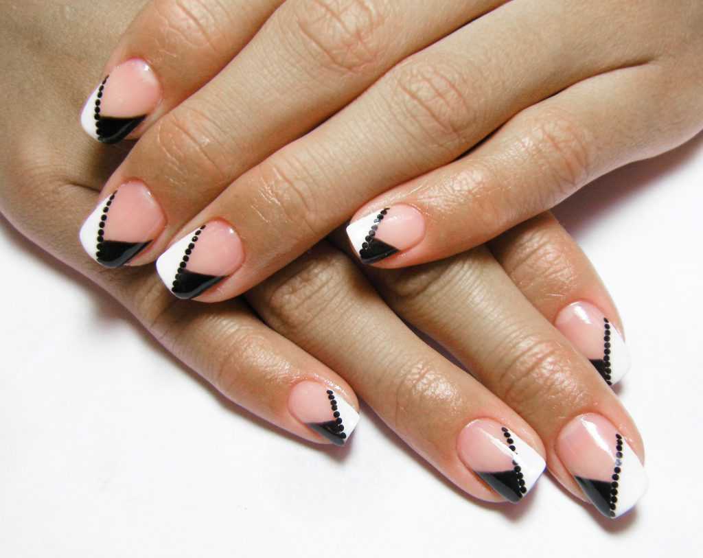Теперь относительно границы. Плавная округлая полоса сменилась на треугольный формат. Цвет нижней части часто выполняется из двух колоров: черного и белого, красного и синего или прочих подходящих по контрасту. Для того, чтобы завершить узор, мастера в изгиб кладут стразы или используют гипюровую наклейку, которая завершает рисунок.