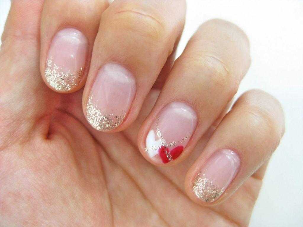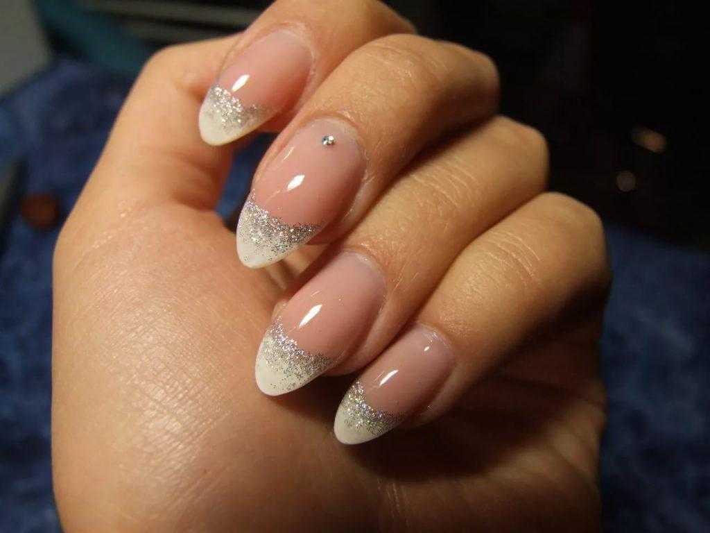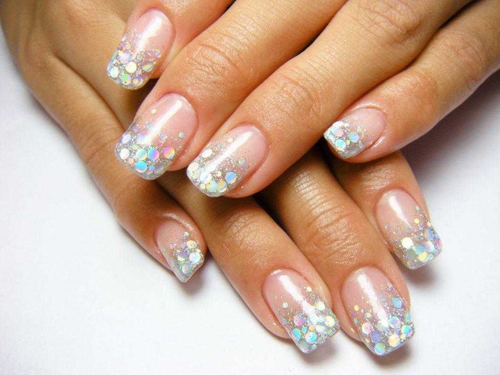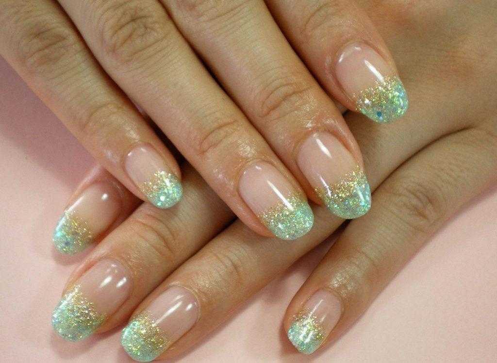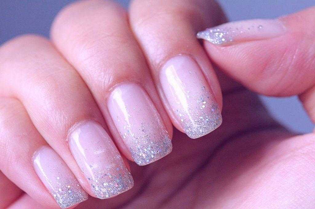 Растяжка градиента блестками – это еще одна прекрасная идея для создания французского маникюра гель лаком. Суть его состоит в том, что в классический френч добавляется немного сверкающих частичек. Для дизайна можно использовать следующие материалы: