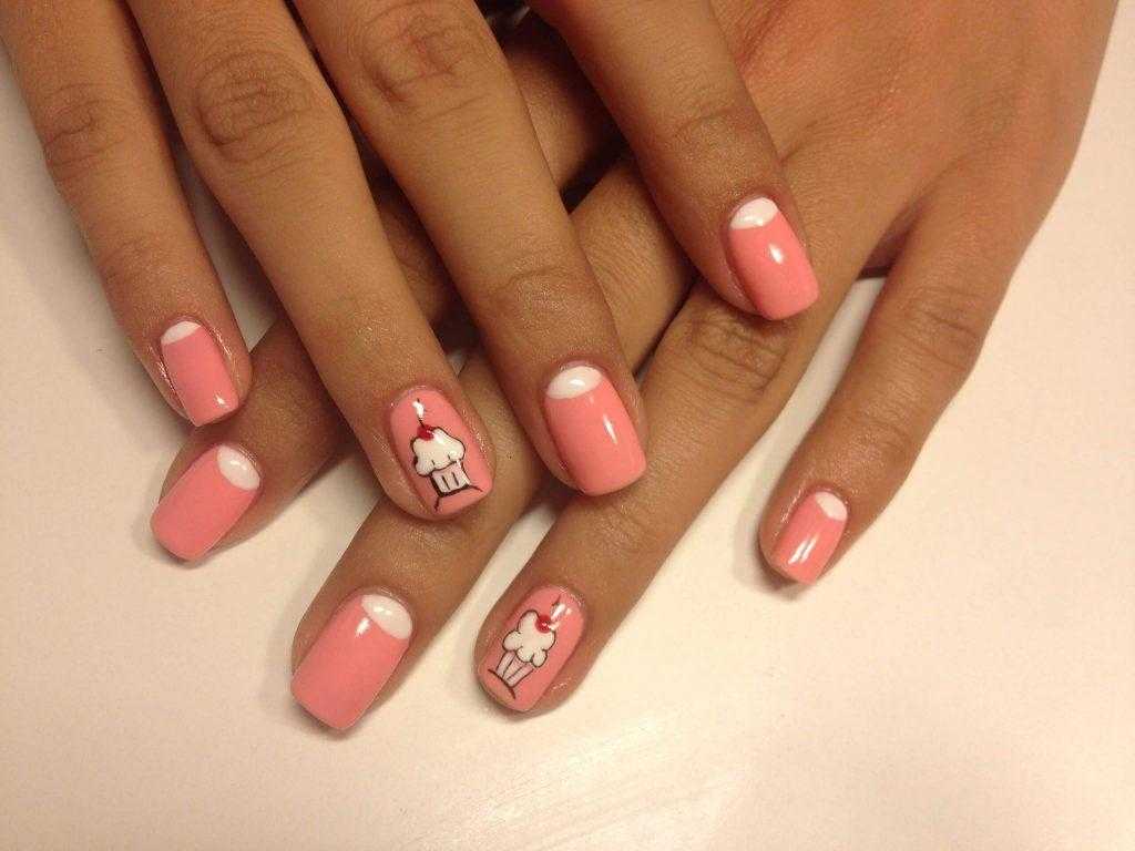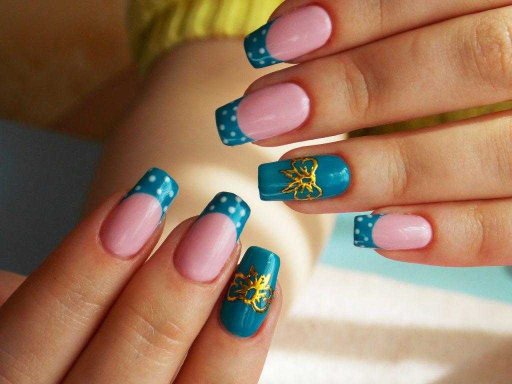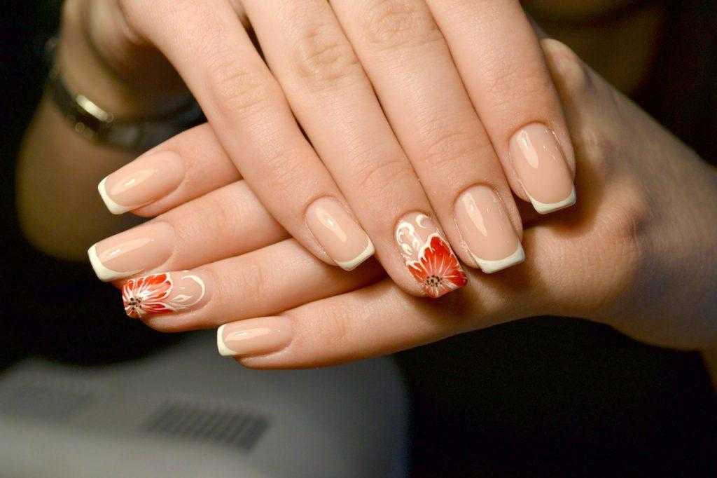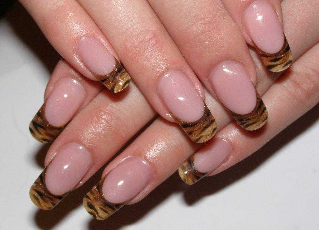 - с дизайном – на 1-2 пальцах можно разместить флористический, геометрический дизайн. К френчу подходят нейл-арты на тропическую тему, с животными, листьями и любым другим декором, который вы хотите видеть на своих ноготках.