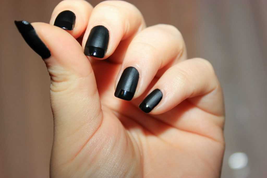 В качестве контраста у основания ногтя, можно взять черный лак и нанести небольшое количество у основания ногтевой платины, растянув вниз. Мастера не рекомендуют наносить лак мазками — тогда полоска получается не ровной и не равномерной, маникюр будет выглядеть неаккуратно.