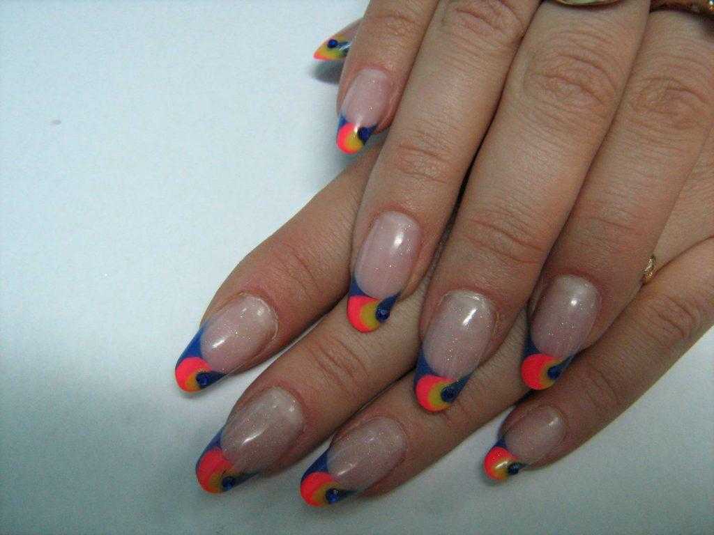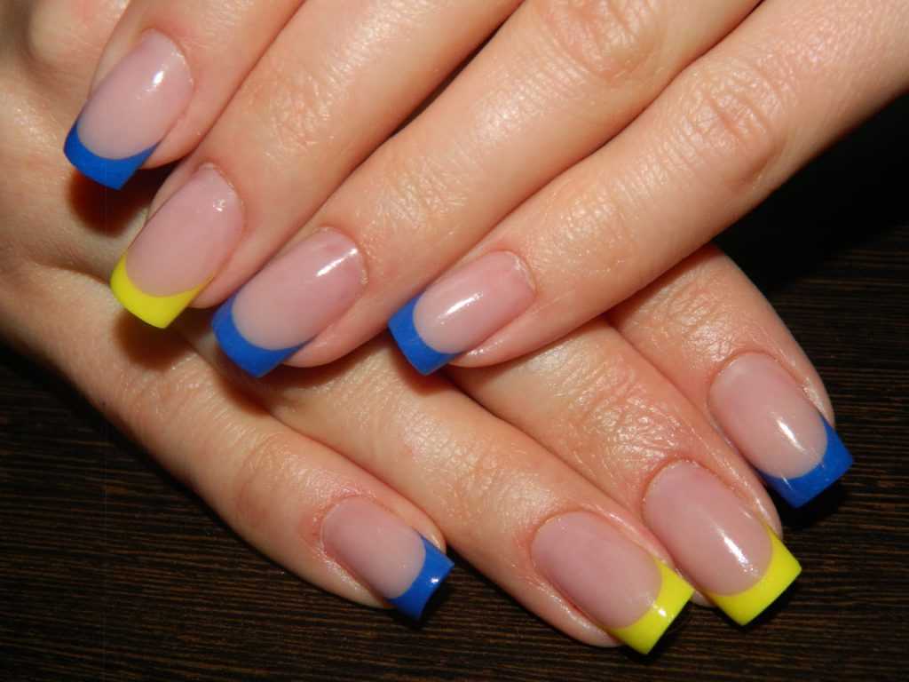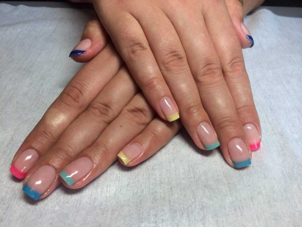Классика цветного френча – спокойный фон и яркие кончики, хотя поиграть можно и с цветом основного покрытия. Делай все то же самое, только белый гель-лак замени на цветной – красный, розовый, голубой, желтый или любой другой.