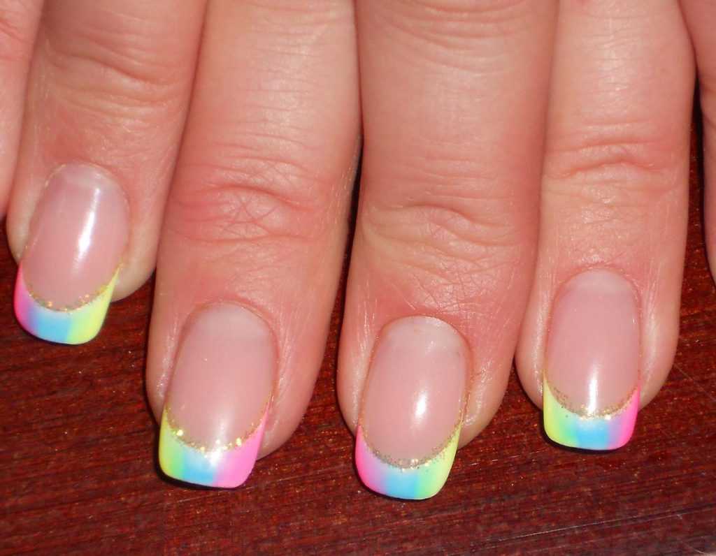 Градиент-френч отличается яркими и сочными красками. Такой дизайн можно сделать с помощью гель лаков или разноцветных гелей. Изящный перекат оттенков прекрасно сочетается с нюдовой камуфляжной подложкой. На каждом ногте можно сделать свой вариант перехода тонов.