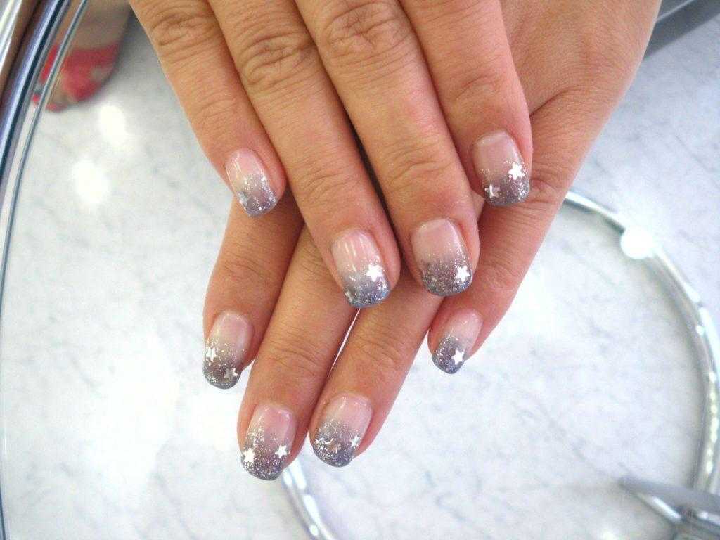 В этом варианте рекомендуется использовать глиттер разной формы, начиная от мелкого и заканчивая самыми крупными фигурными блестками, палочками, звездочками, сердечками или ромбами. Суть омбре состоит в том, что на кончике концентрация блесток очень высока. Но ближе к кутикуле они должны рассеиваться, как звездная россыпь в небе. Растяжку из блесток можно сделать с помощью круглой или тонкой кисти.
