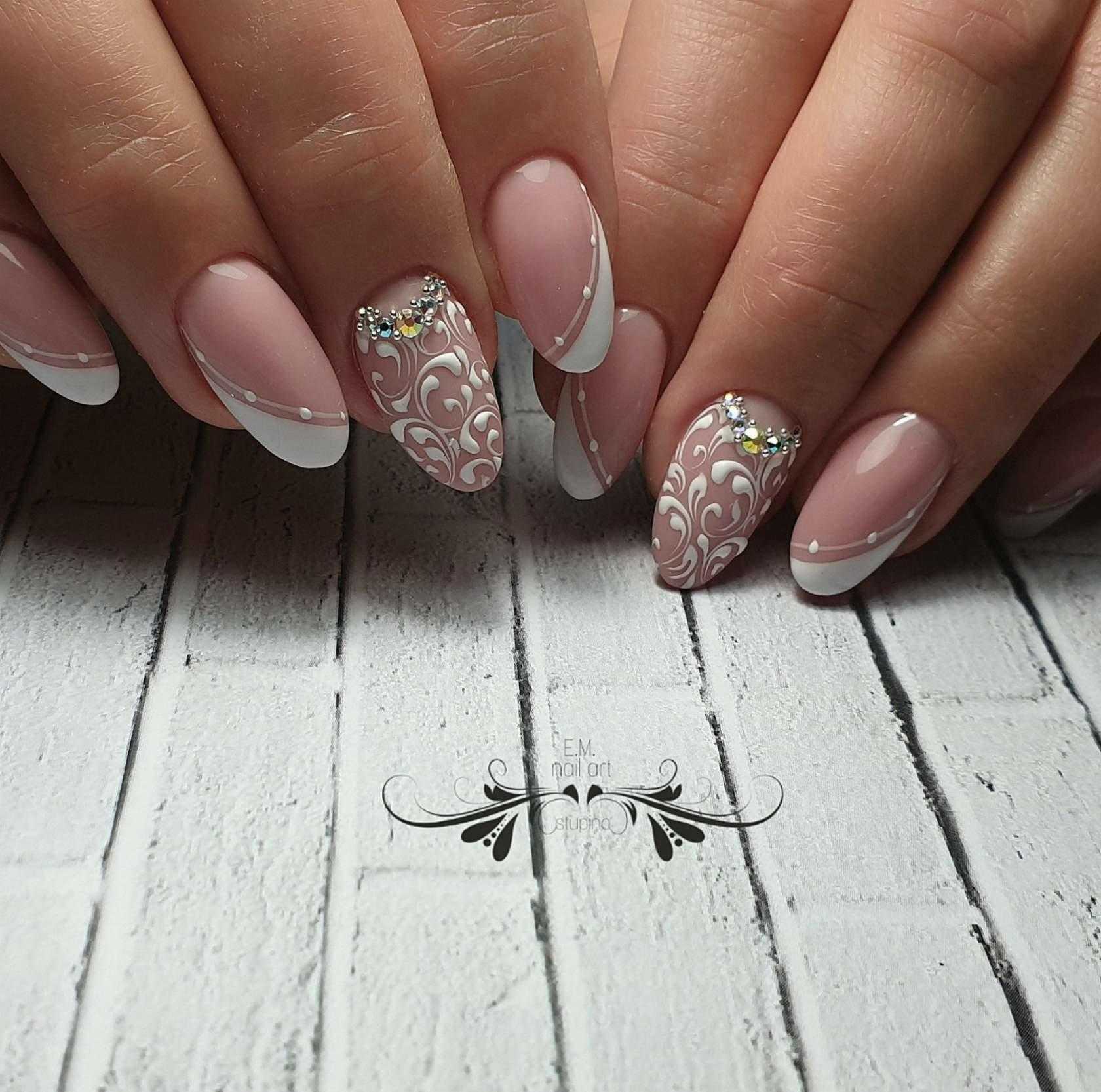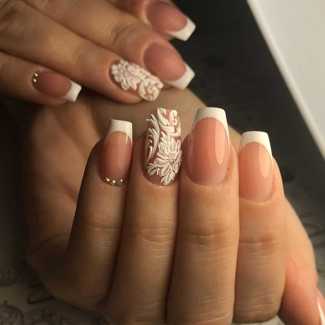 По традиции образ невесты нежный и романтичный, поэтому маникюр как нельзя лучше подходит для этого. Свадебный френч, нюд, втирка, с кружевом, градиент. Оформление может быть самым разным.