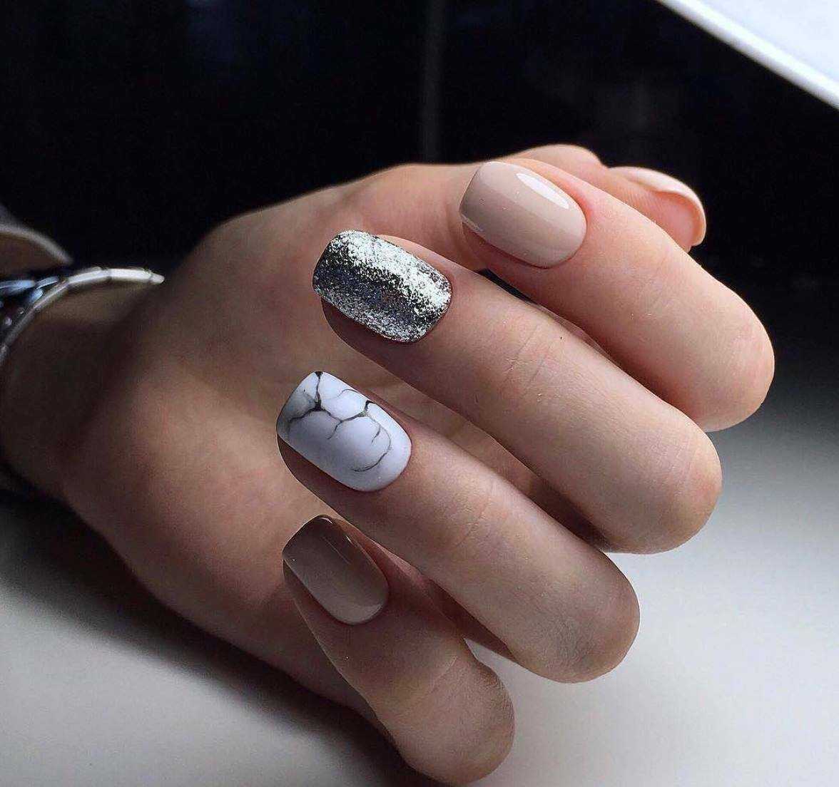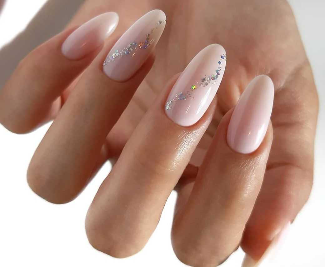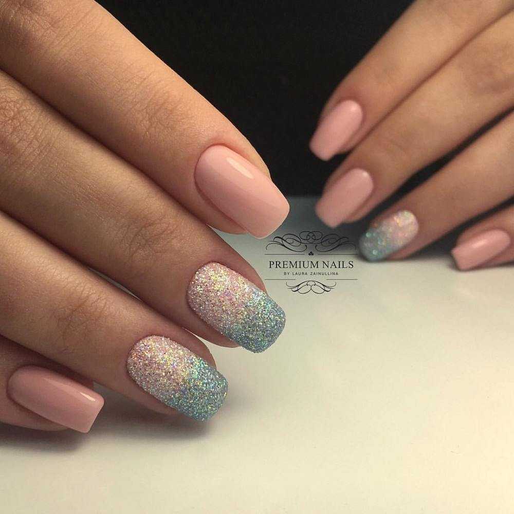 Нежные тона в сочетании техники глиттер — никогда не выйдут из моды. Такой дизайн используют как при создании классического маникюра, так и маникюра в стиле гротеск. Он идеален для вечеринки и прекрасно сочетается с любой одеждой в обычные дни. Хорошо будет смотреться глиттер как дополнительный декор, так и для создания основного маникюра. Не выходят из моды и стразы! На нежных тонких ручках они выглядят особенно изысканно. Цель — гармоничный результат. Сверкающие камни, блестки, стразы всё будет «к лицу» нежному, но неброскому маникюру. Не теряет популярности графический рисунок, а именно полоски на поверхности ногтя. Тоненькая полоска на однотонном монохромном покрытии придает изюминку общему виду, делая маникюр стильным.