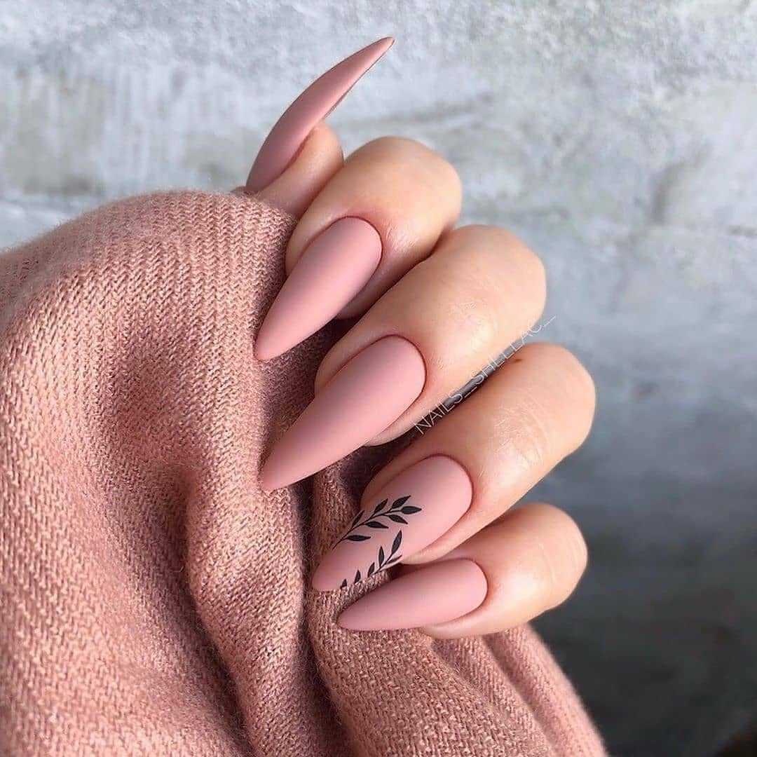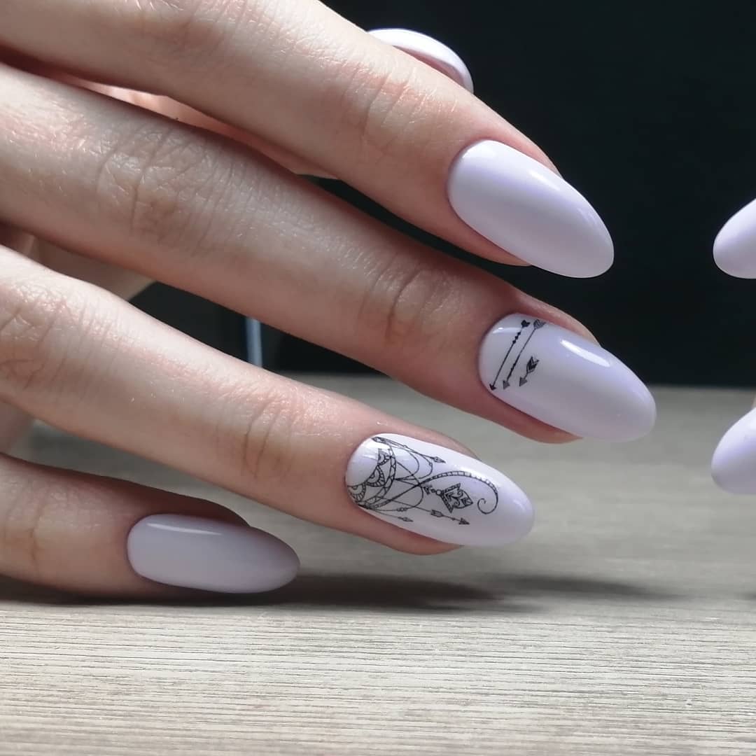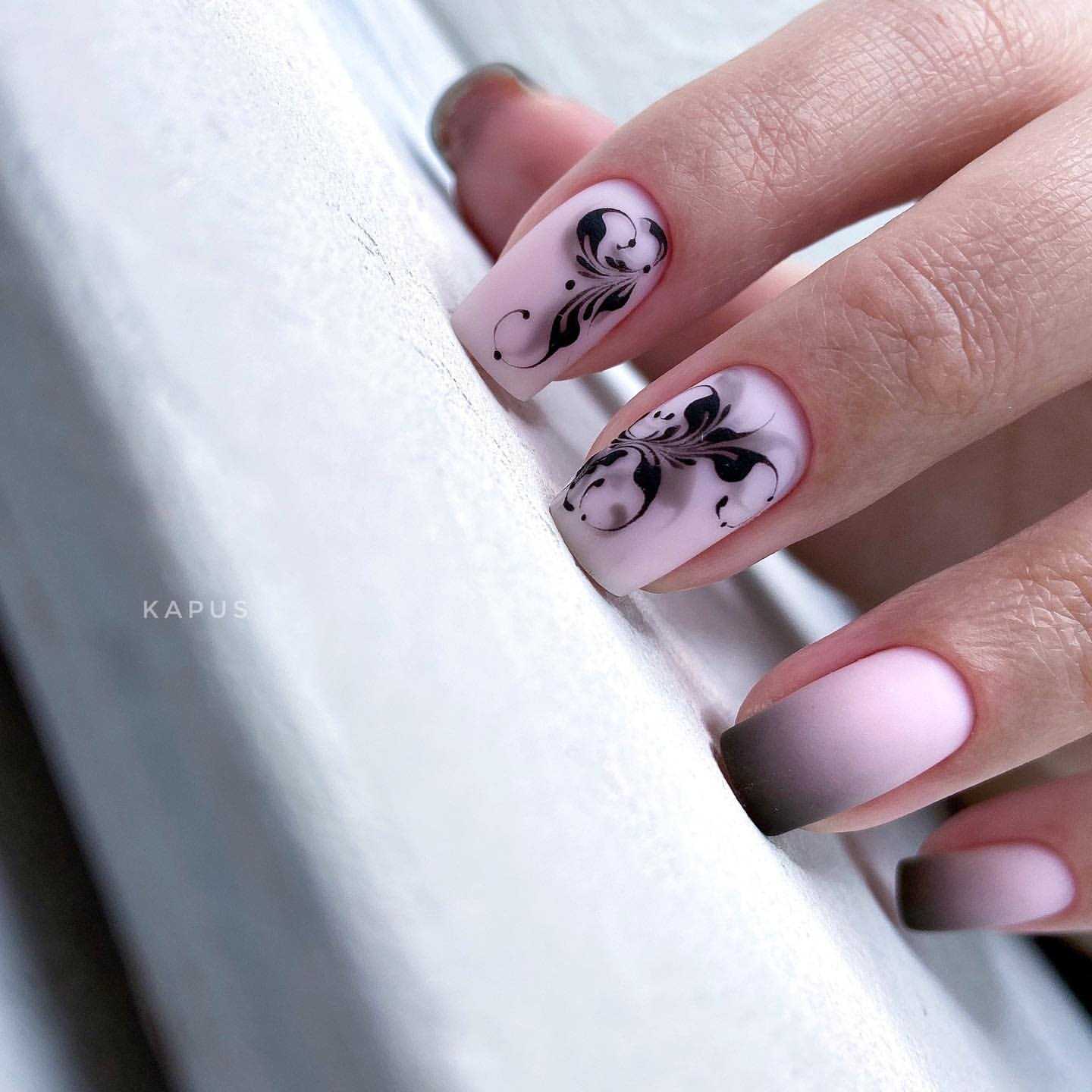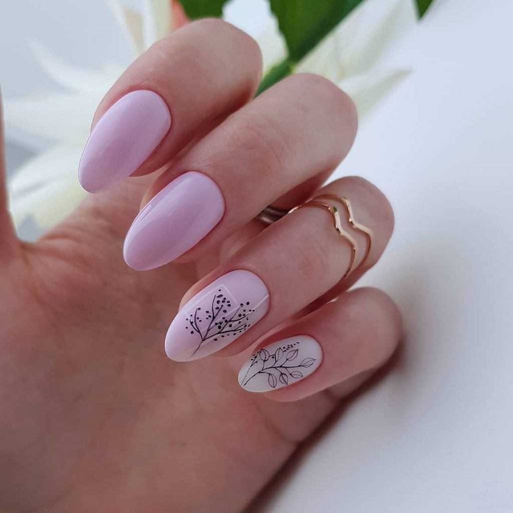 Маникюр с черным рисунком в виде листа растения. Популярный в этом сезоне дизайн сочетается со стилем минимализм, также модным и востребованным в нейл-индустрии.