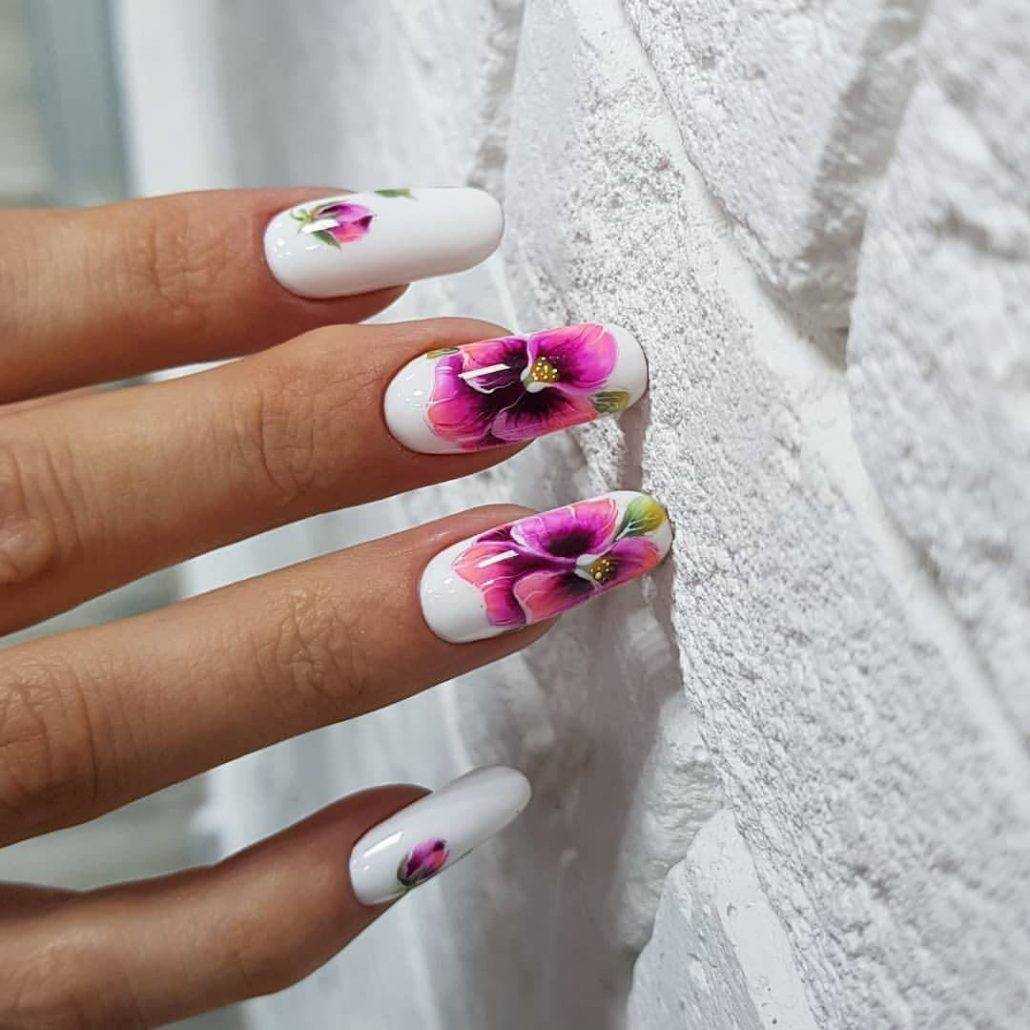 Рисунки на белом маникюре делают любыми цветами и смотрятся они потрясающе. Можно использовать готовые слайдеры, можно рисовать красками, гель лаками, акварелью и даже специальными маркерами. Текстуры волны, камня, животных расцветок прекрасно дополняют вкрапления потали, фольги, блесток. Вензеля, геометрия, точки и полоски тоже остаются модными вариантами дизайнов. В зависимости от настроения можно использовать яркие рисунки фруктов или цветов, морских мотивов. А можно сделать еле заметные акварельные нежные цветочки, веточки, камушки.