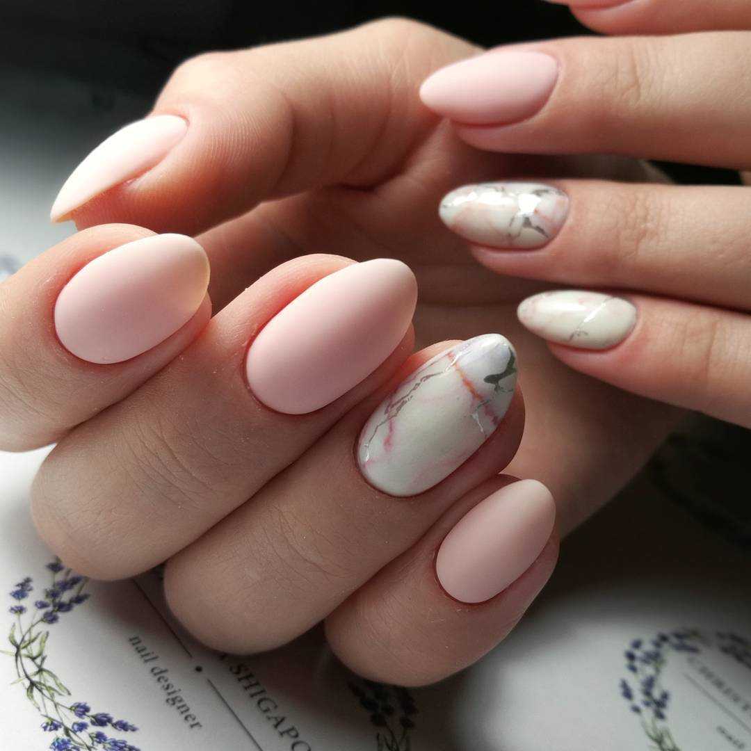 Модная тенденция светлого маникюра 2019 года удерживает позиции кремовых тонов, преимущественно с плавными переходом от совсем светленького до умеренного на каждом пальце. Один ноготок или рисунок на одном или нескольких пластинах рекомендуется выделить матовым покрытием.