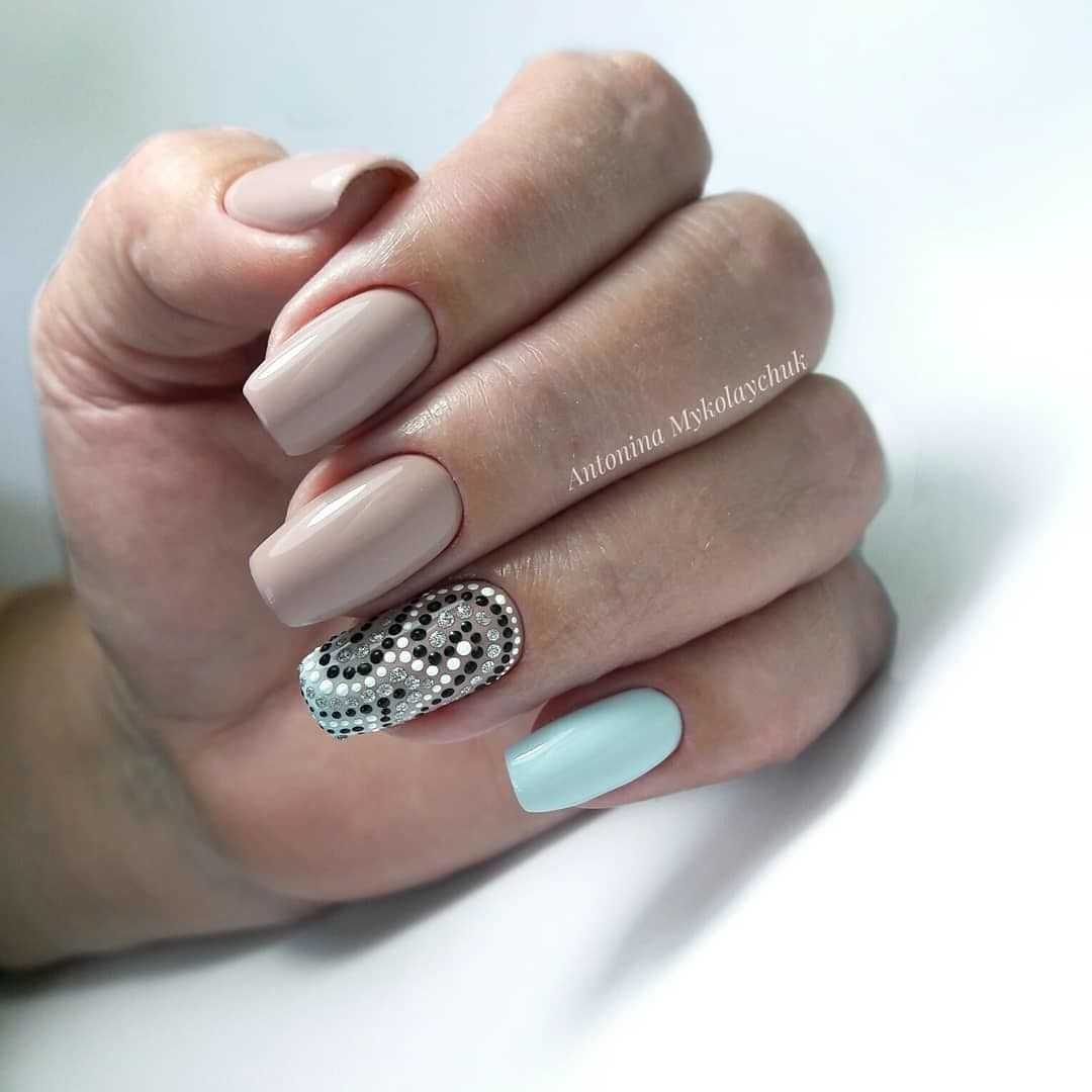 Лучшее дополнение нежных цветов в маникюре – это фольга, глиттер, серебряная втирка. Решили разнообразить нежный цвет на ногтях? Мастер нейл-арта может предложить вам поочередное окрашивание ногтей блестящим декором и нежным лаком. С помощью фольги выделяют 1-2 ноготка на руке. Серебряным глиттером украшают ноготки мятных, серых, нежно-розовых и нежно-голубых цветов. Также такой декор, как глиттер, популярно использовать во французском маникюре. С помощью него выделяют край ноготка.