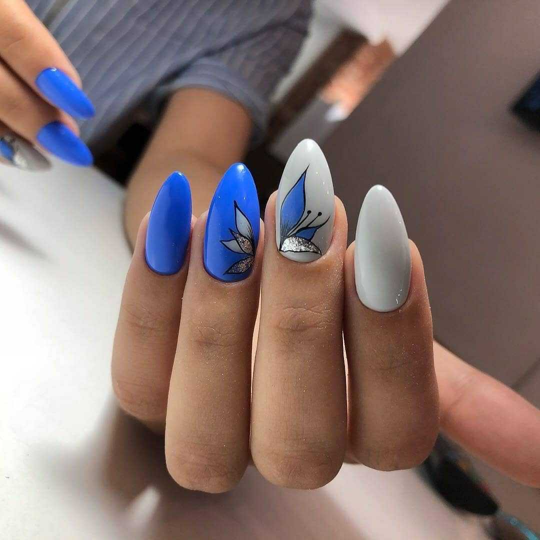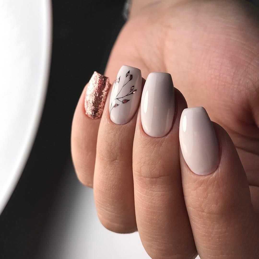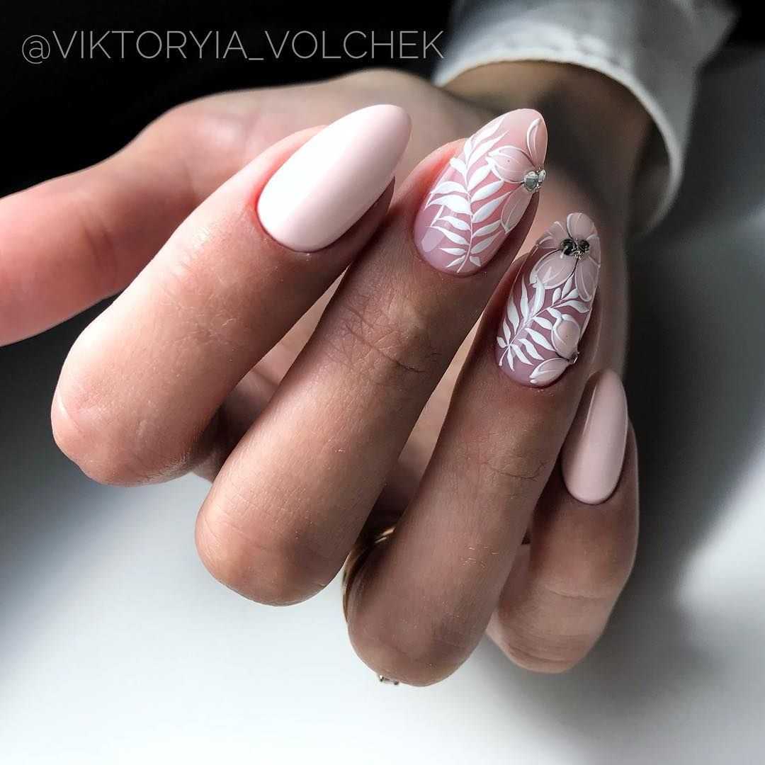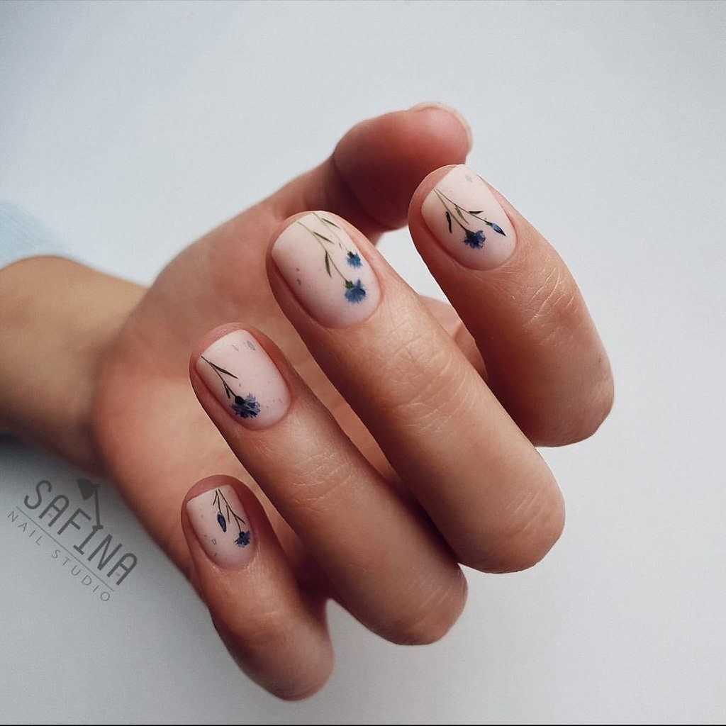 Цветы считаются лучшим украшением нежного маникюра. Особо выразительно и ярко цветы смотрятся на белом, розовом и бежевом фоне. Сами рисунки могут быть разнообразными: прекрасные розы, нежные пионы, ромашки и многие другие. Главное правило в таком маникюре, чтобы цветовая палитра рисунка сочеталась и была схожа с основным цветом маникюра. Как пример, если вы выбрали основным цветом голубой, цветы на нем должны быть того же голубого тона, только чуть светлее или темнее. Модная новинка этого сезона — маникюр в минимализме с бутонами, листочками или веточками. В таком исполнении маникюр смотрится более ярко. Для такого нейл-арта часто используют стемпинг или же готовые наклейки.
