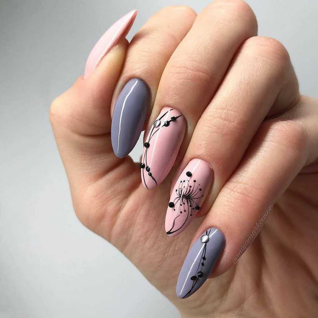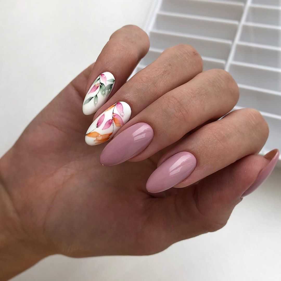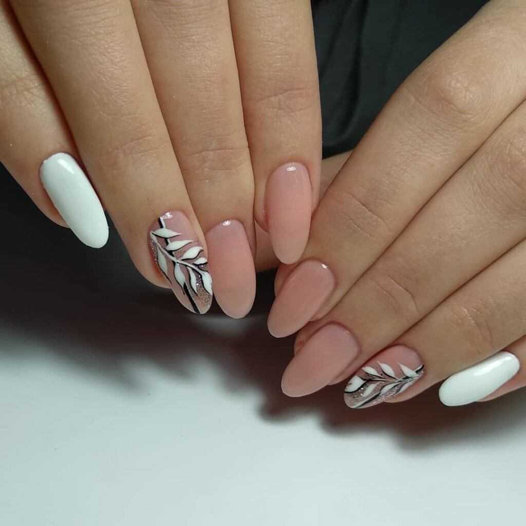 Женственный, изысканный маникюр с растительными узорами и легкой геометрией для ногтей миндальной формы.