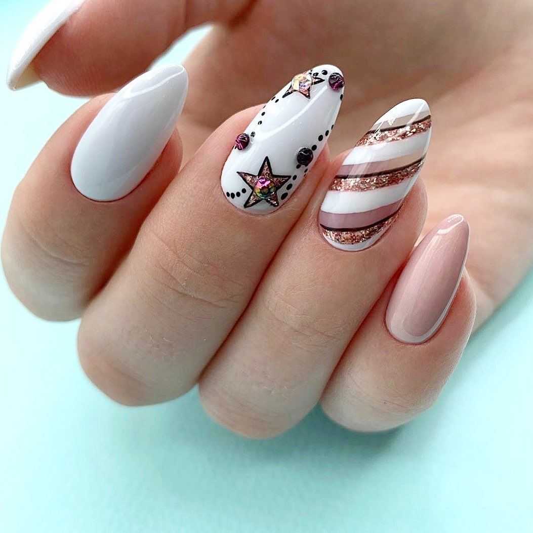 Праздничный нарядный маникюр в нежных тонах подчеркнет изысканность и женственность. Разнообразный декор поможет создать блистающий и запоминающийся лук: стразы, пайетки, бульонки, яркие мазки.