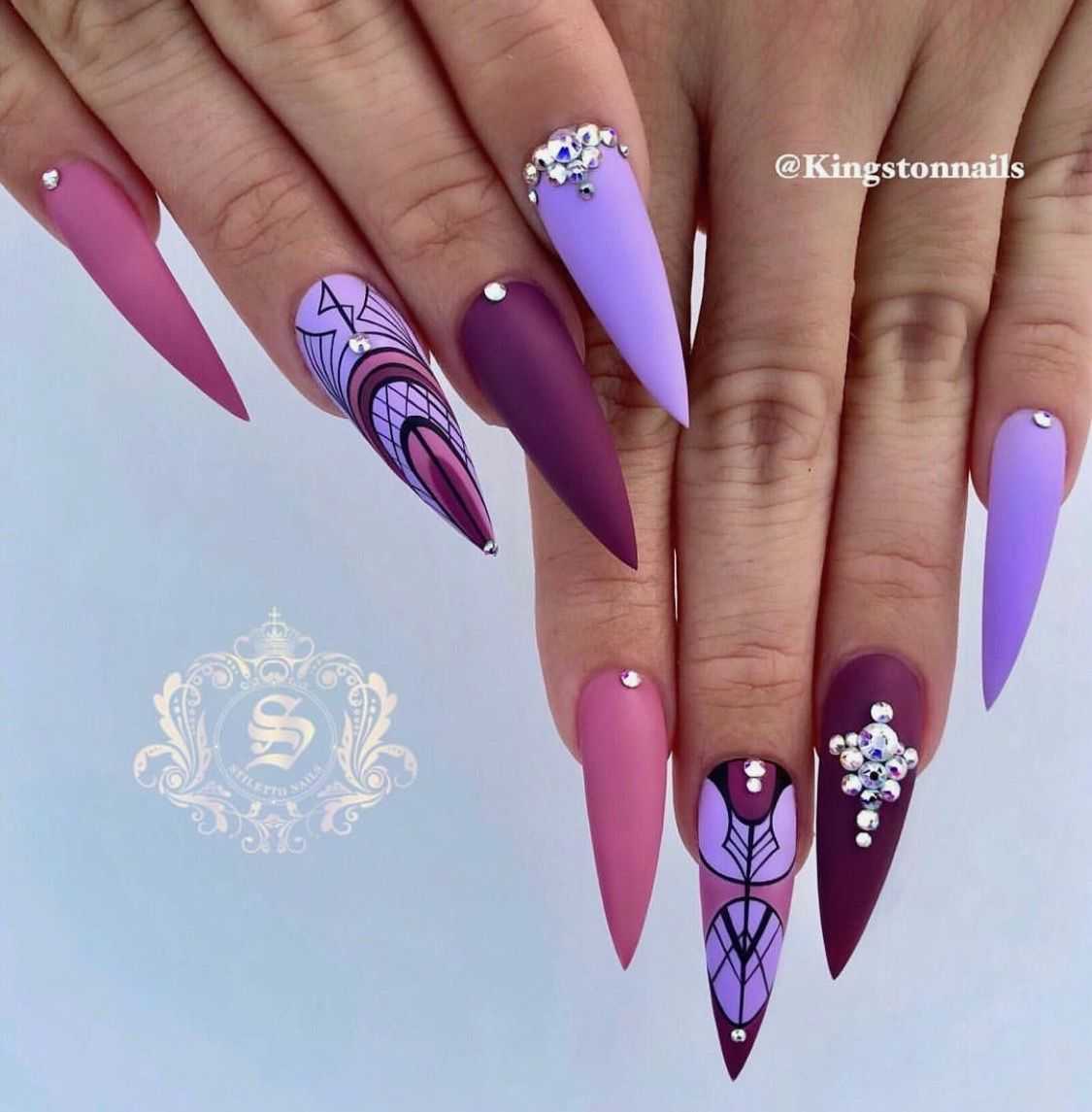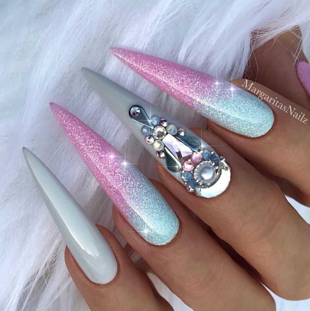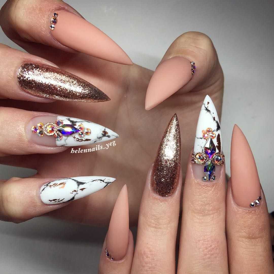 На длинные ногти с заостренным кончиком подойдет любой топовый нейл-арт этого года. А это и привычные стразы, и паетки, камешки, фольга и новое течение — надписи, что удачно смотрится на длинных.