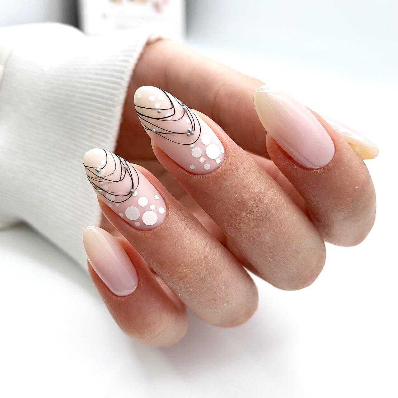 Нежный дизайн ногтей, совмещающий негативное пространство и геометрию.