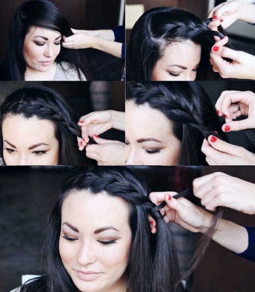 - Плетение и косички. Конечно, если волосы совсем короткие, косичку заплести не получится, а вот на чуть большей длине вполне возможно. Плести косичку нужно по линии роста волос вдоль лба. Это нужно, чтобы она лучше держалась.