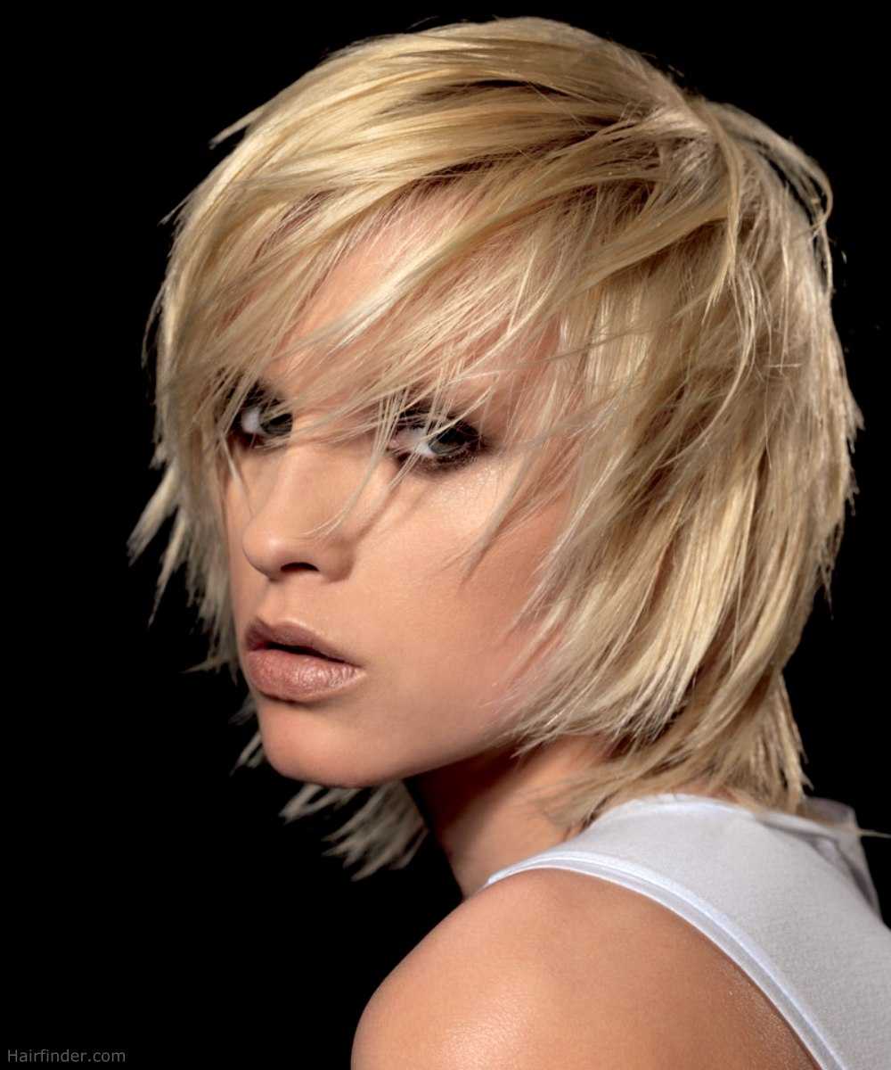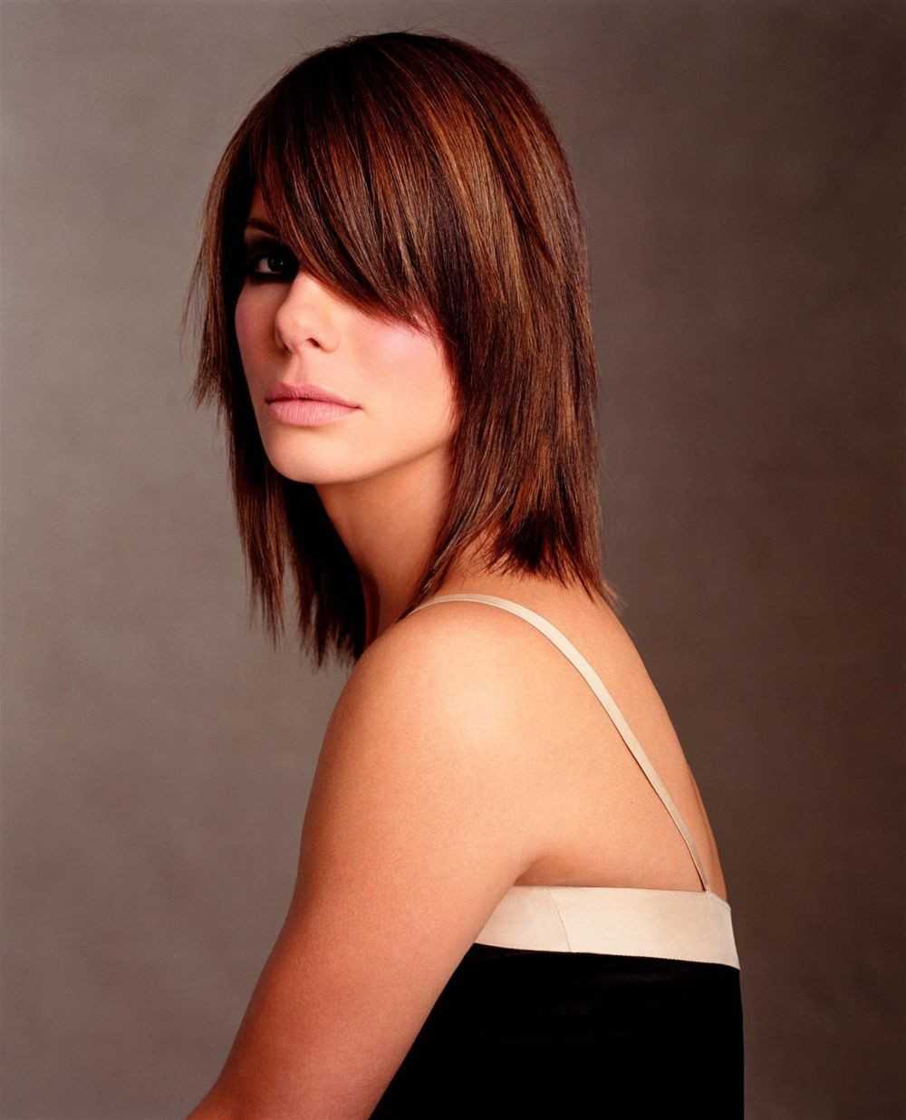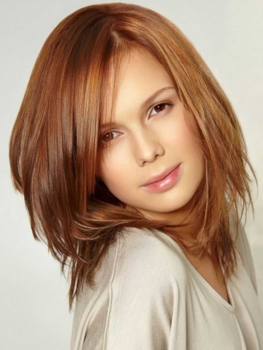 Еще одним способом скрыть углы и резкость лица является косая челка. В каскаде на средние волосы ее можно удлинить, что зрительно вытянет округлость. Нежелательно использовать косую укладку для длиннолицых представительниц.