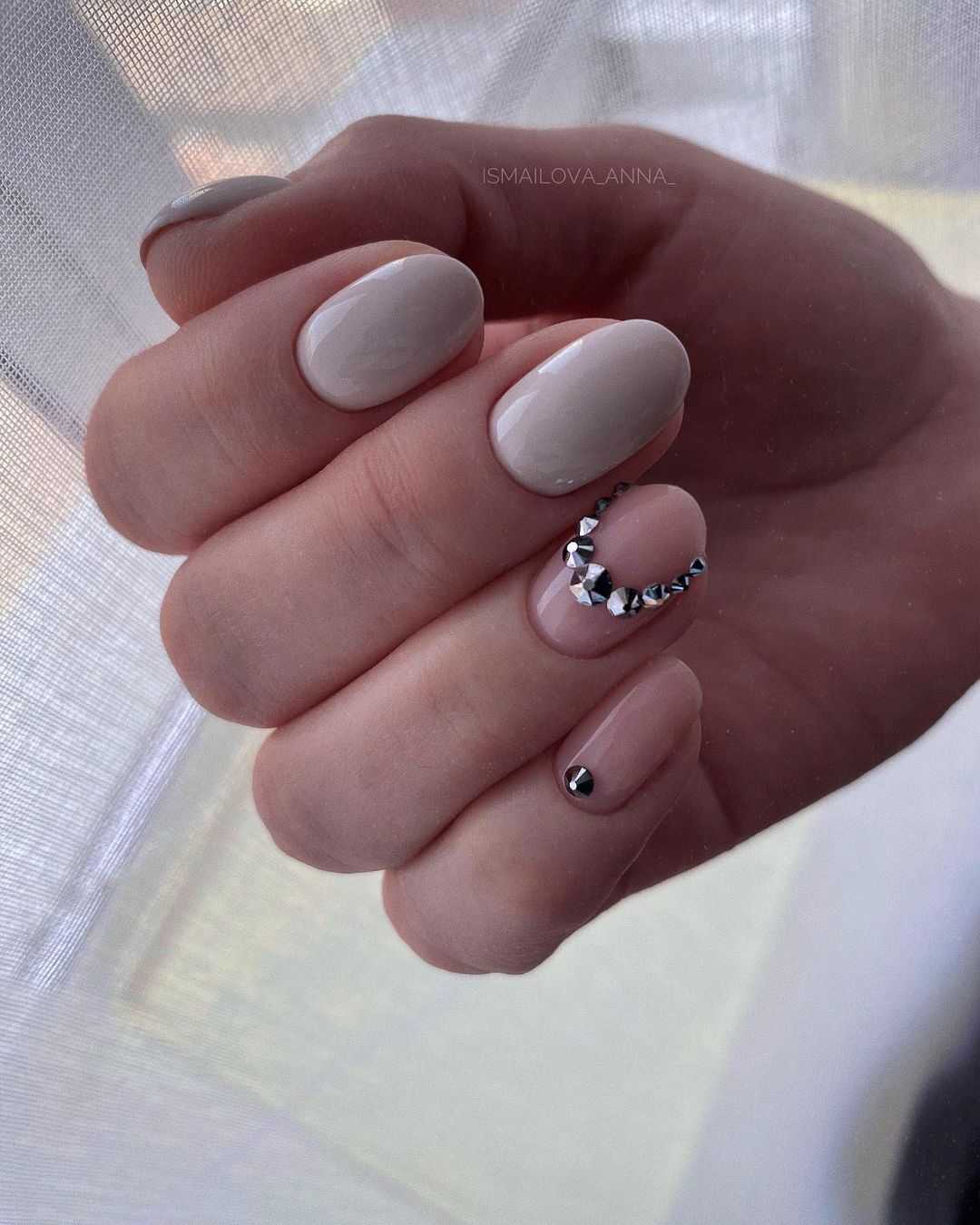 Овальная форма ногтей максимально естественно смотрится на любой длине, поэтому короткие овальные ногти объявлены трендом 2022 года. Такая форма свободного кончика очень красиво сочетается с улыбкой френча и прозрачными лунками, может дополняться узорами из стразов либо бусин и различными рисунками. Особенно впечатляют аккуратные изображения в стиле минимализм, которые нанесены на основание ногтей как парные картинки. К примеру, на одном ногте тонкая веточка расположена по краю пластины, а на другом – у основания.