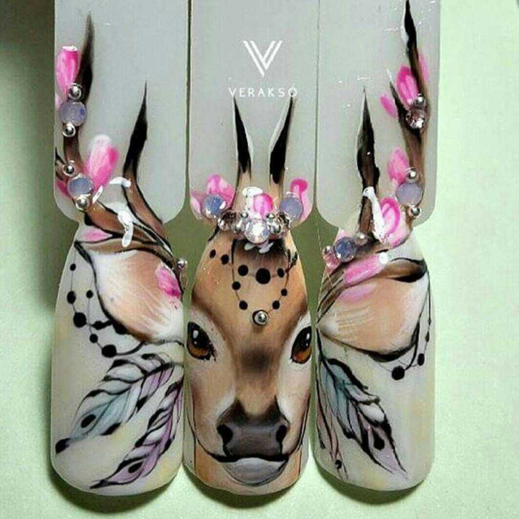 Когда хочется сказки и волшебства — создавайте ее на ногтях, это проще всего. Олени, Санта Клаус или наш привычный дедушка Мороз — используйте их образы для декора. Смотрится такой маникюр просто здорово и особенно актуален для родителей деток, планирующих побывать на утренниках и представлениях в честь Нового года.