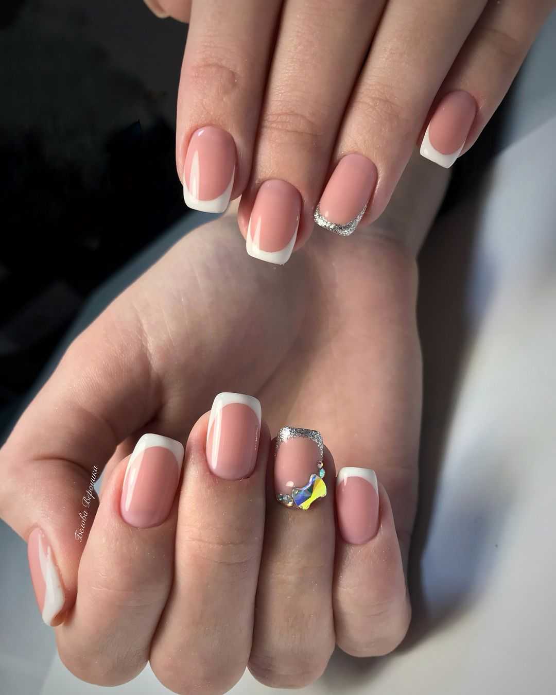 Спокойное сочетание нюда и белого играет по-новому, если один пальчик усыпать крупными блестками.