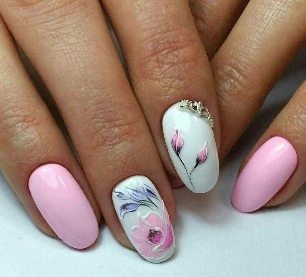 Флористика – лучший декор, который можно представить себе в весенних и летних нейл-артах. В 2020 году дизайн с цветами стал умереннее. Теперь однотонный маникюр разбавляется 1-2 узорами на акцентных пальцах. Не стоит украшать ноготки яркими слайдерами, полностью покрывающими ногтевую пластину. Такой дизайн уже не актуален.