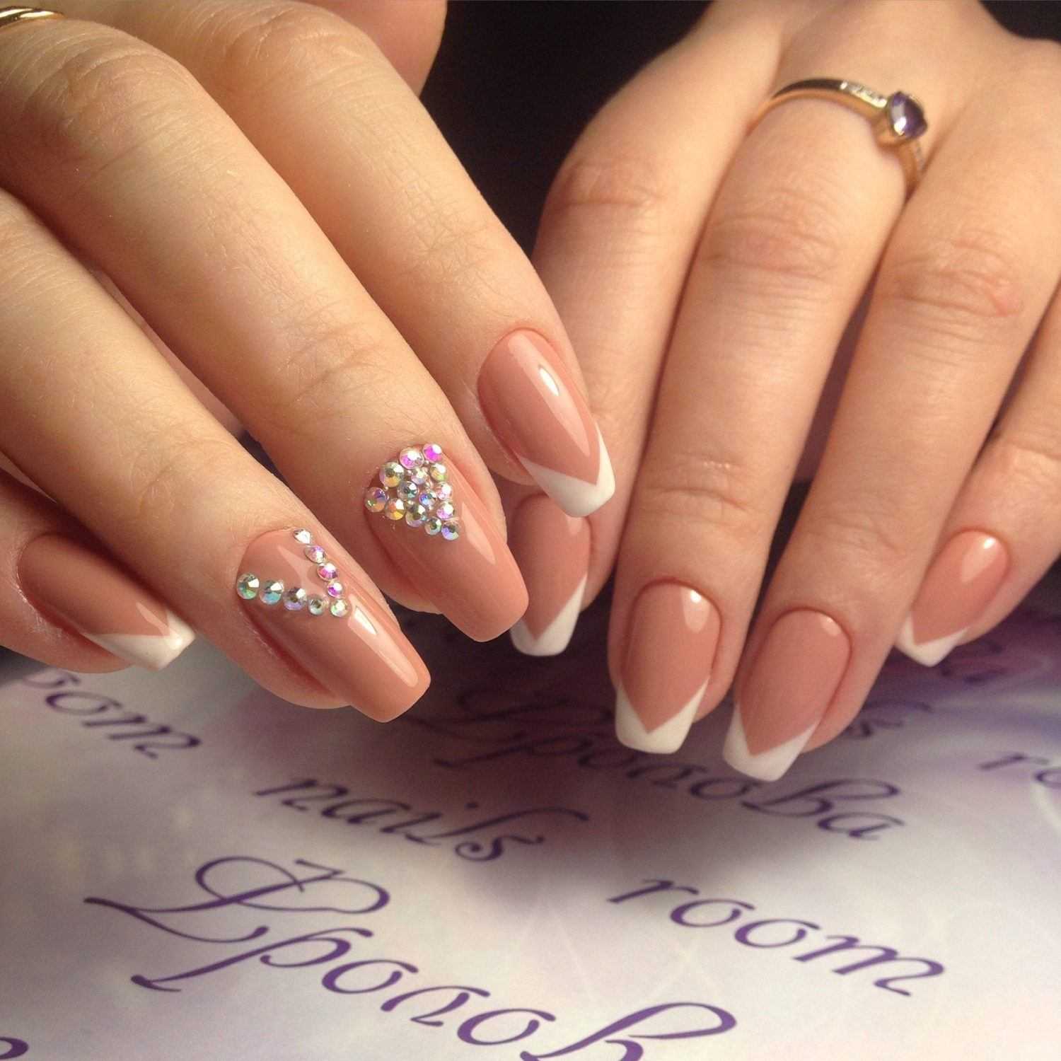 Относительно новый вариант оформления улыбки французского маникюра — в виде буквы V. Чем длиннее ноготь, тем объемнее и длиннее может быть шеврон. Его можно оформить в разные оттенки, добавить стразы или блестки. Хотя название звучит по-военному, это не означает, что шеврон должен быть выполнен грубо и толсто. Иногда достаточно сделать тонкие полоски в форме буквы V и такой прием сделает привычный дизайн максимально необычным и удивительным.