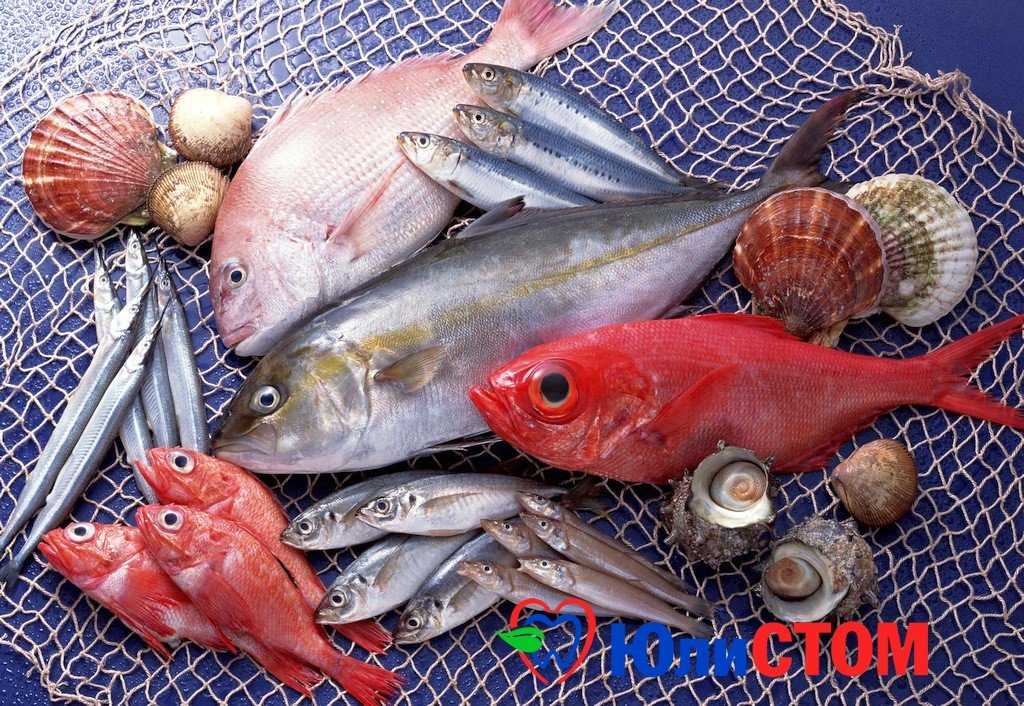 Также много кальция и витамина D в рыбе и других морепродуктах. Как известно, они первые помощники при остеопорозе — проблемах с зубами у пожилых людей.