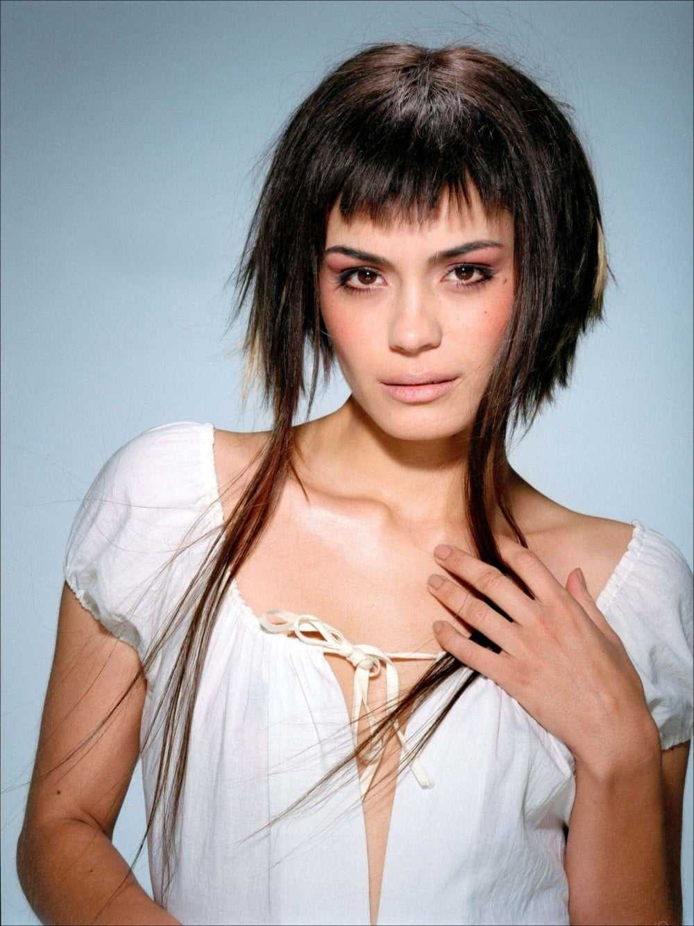 В классическом исполнении стрижется без челки, с удлинением к нижнему слою. Отлично сочетается с косой или рваной челкой. Идеально ровная и густая как у Клеопатры челка в этой стрижке смотреться не будет.