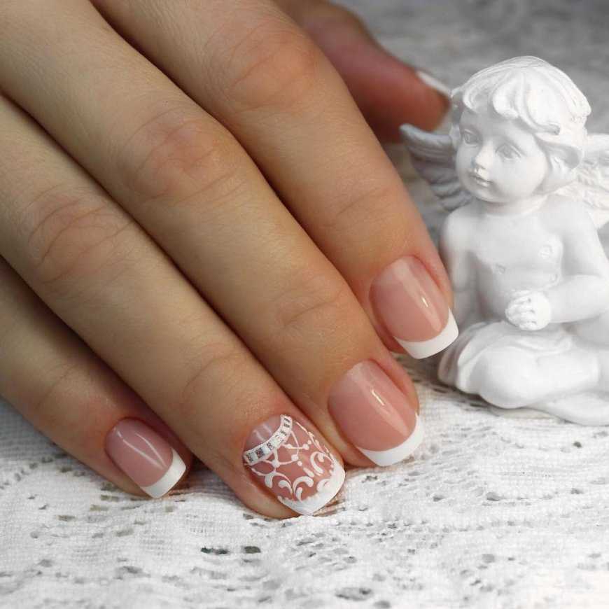 - Белый. Чтобы маникюр смотрелся более современно, можно дополнить его модными техниками и декором.