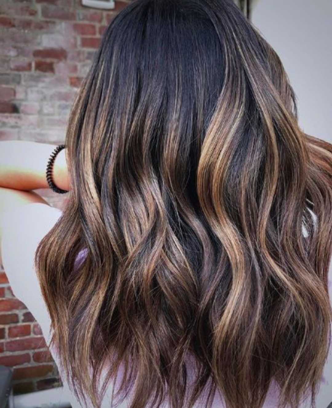 Черный цвет волос можно осветлить в технике балаяж до каштанового, шоколадного или кофейного оттенка. Как всегда, осветлять рекомендуется прядями.