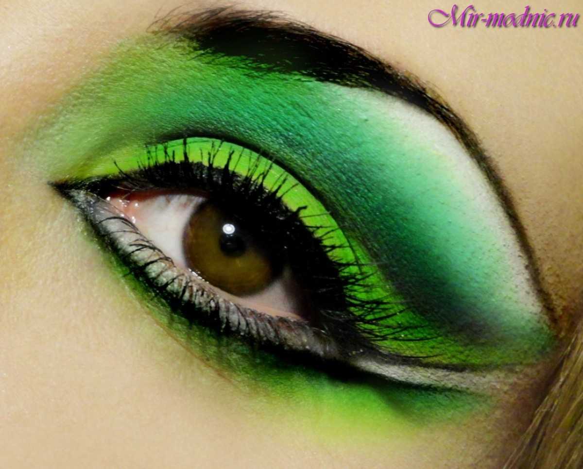 - Яркие неоновые тени. Все, что нужно, это наложить слой теней (зеленые глаза подчеркнут синие, золотые, красные и фиолетовые оттенки).