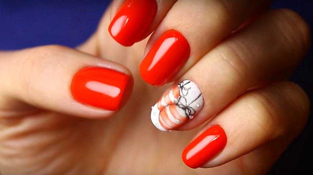 - Тонкой кистью с красным гель-лаком провести тонкие диагональные линии через весь ноготь.