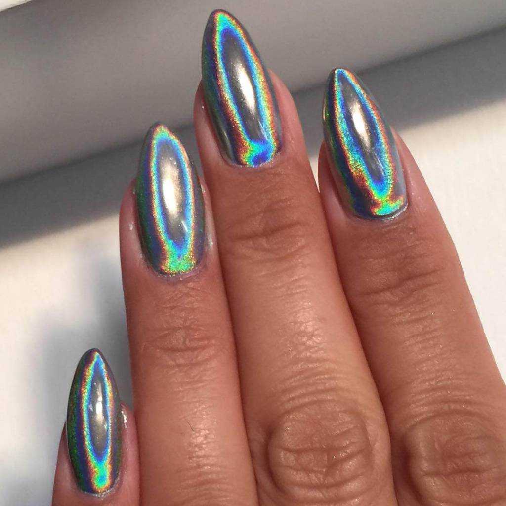 Чтобы получить эффект «битого стекла», небольшие кусочки голографической пленки или специальной слюды прикрепляют к ноготкам в хаотичном или правильном положении. Получается определенный орнамент и, когда свет попадает на него, он переливается своеобразными красивыми оттенками.