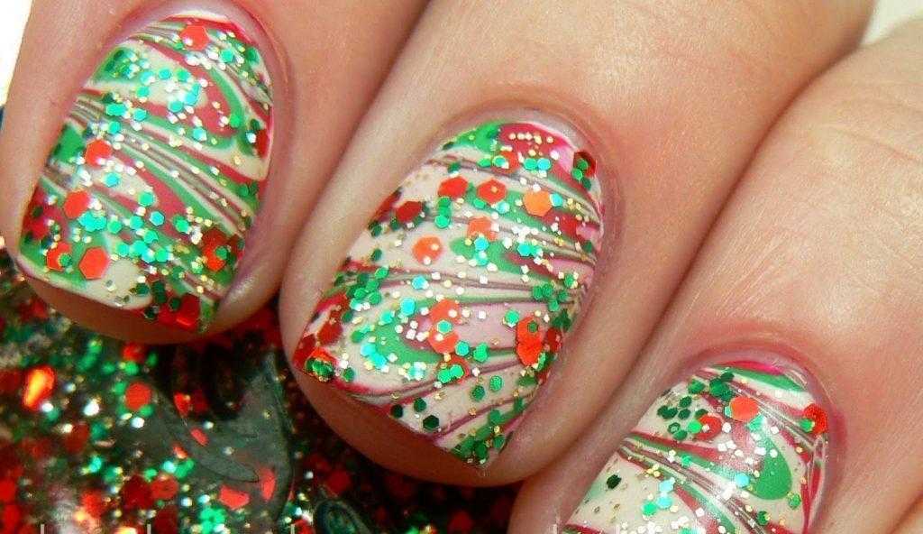 Эффект легкой ненавязчивой акварельки, новогодние цвета и тонкие линии освежают новогодний дизайн ногтей, который можно увидеть на фото.