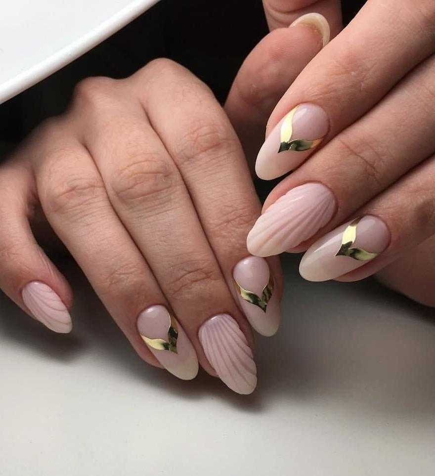 Список модных трендов не может существовать без нюдового маникюра. Это базовый дизайн, с которым вы всегда будете оставаться стильной. На бежевой подложке будет отлично смотреться любой декор. Без каких-либо украшений маникюр будет выглядеть не менее круто. Если вы хотите создать праздничный дизайн, можно добавить немного золота. С золотым декором бежевый маникюр моментально приобретает аристократичный вид. Для этого можно использовать фольгу, золотые бусинки, камифубуки или золотистые гель-лаки. Мягкий и лаконичный вариант можно создать при помощи матового топа. Такой вариант оформления в любой ситуации удачно украсит ваш образ.