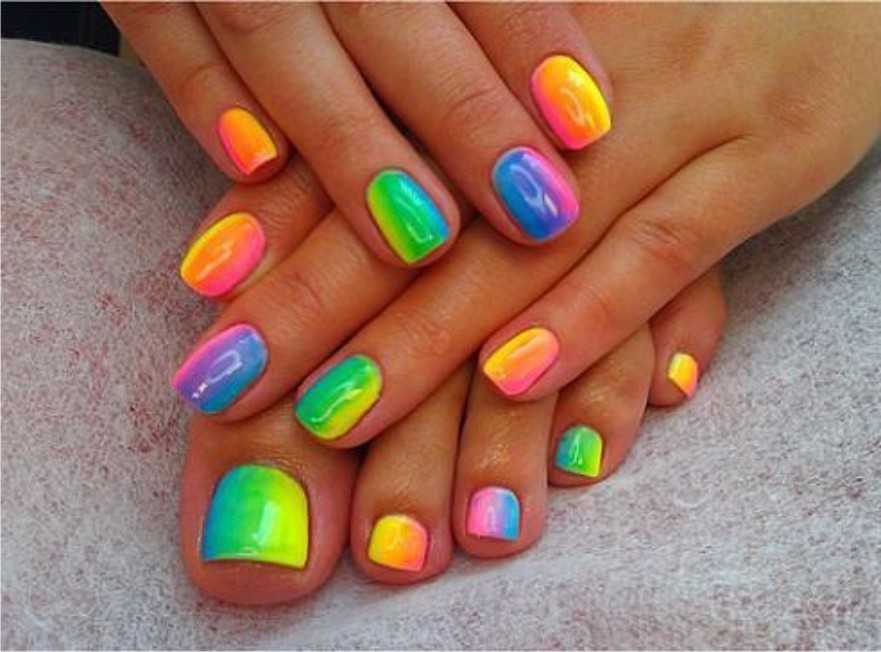 Яркий, красочный и необычный дизайн ногтей в технике обмре можно выполнить при помощи гель-лака неоновых оттенков. Для создания маникюра нужно подготовить несколько понравившихся цветов и матовый тон, который сделает неоновый градиент более интересным и стильным. Чтобы выделить отдельные пальчики, можно засыпать их ярким глиттером.