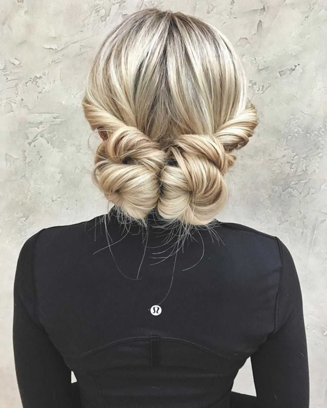- Оригинальный пучок также делается на основе хвоста. Он собирается на макушке и делится на две части. Одна часть крепко закручивается вокруг основания и крепко закрепляется заколкой. Вторая часть укладывается небрежно.