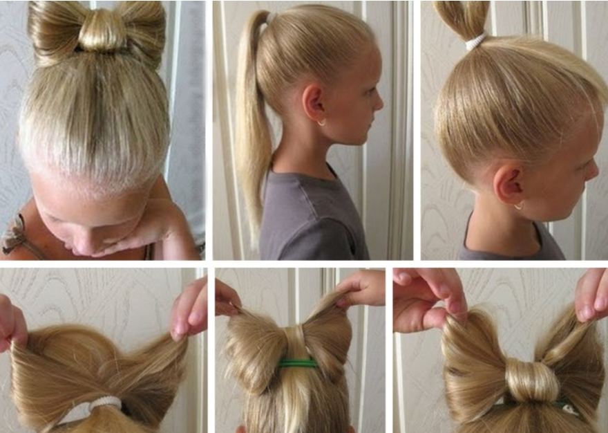 Если научиться выполнять основу, то прическа может меняться. К примеру, добавлять завитки или плетения. Банты делают на боку, высоко и низко. Основная укладка выполняется так: