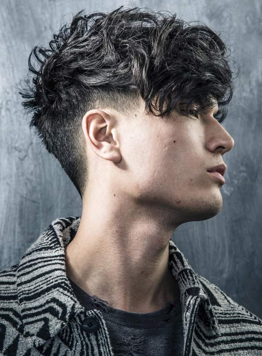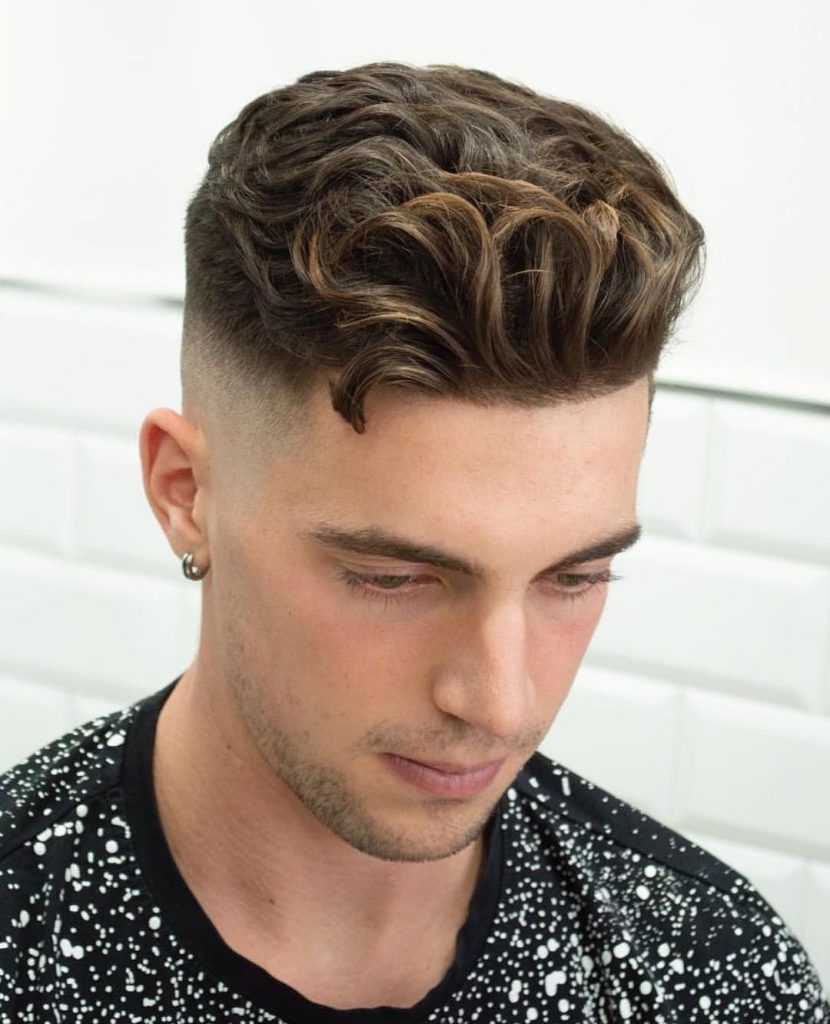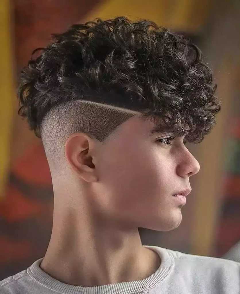 Яркий и неординарный вид прически с выбритыми висками, укороченным затылком. Центральная теменная часть стрижется на разную длину: достаточно короткая макушка и удлиненная челка. Она показывает всю красоту кудрявых мужских волос.