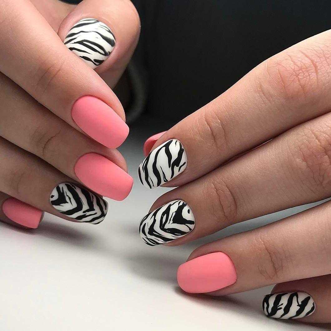 В тренде маникюр с леопардовым принтом, с декором зебры и т.д. Если леопардовый дизайн смотрится слишком выразительно и заметно, но маникюр с зеброй отлично впишется в повседневный образ. Узор можно сочетать с белым, черным, розовым оттенками.
