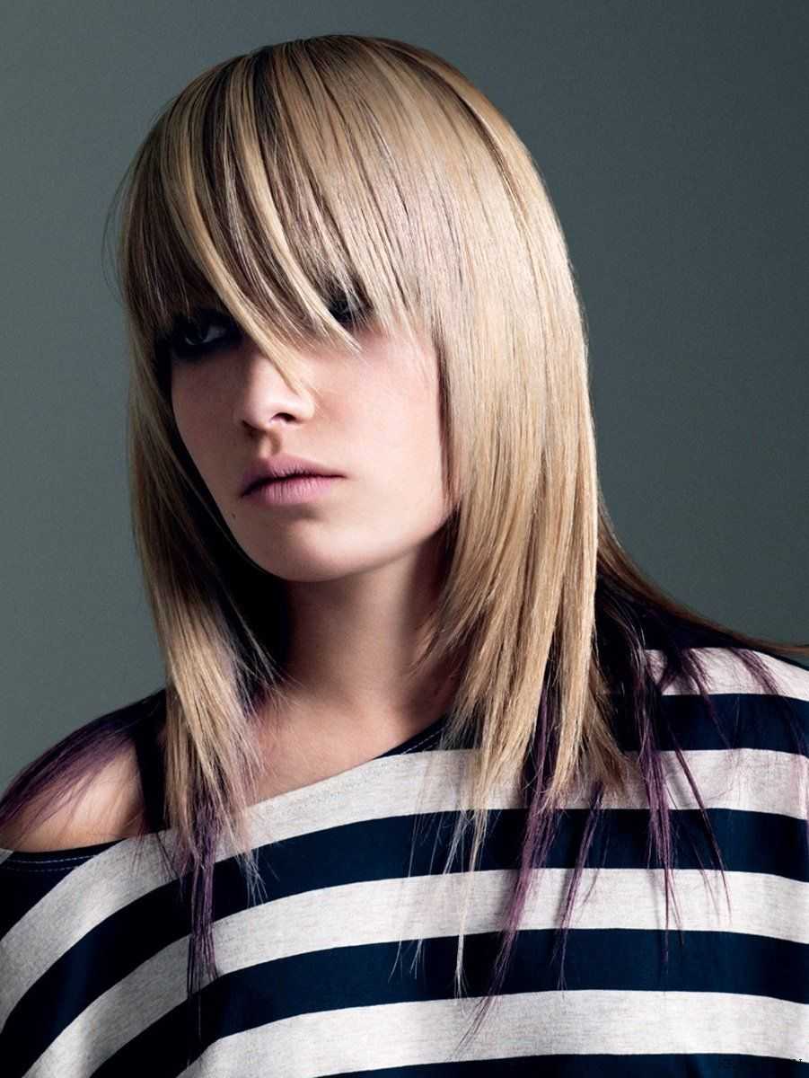 Косая челка в каскаде на среднюю длину волос помогает привлечь внимание к определенным частям лица. Например, к глазам, к скулам или к носу