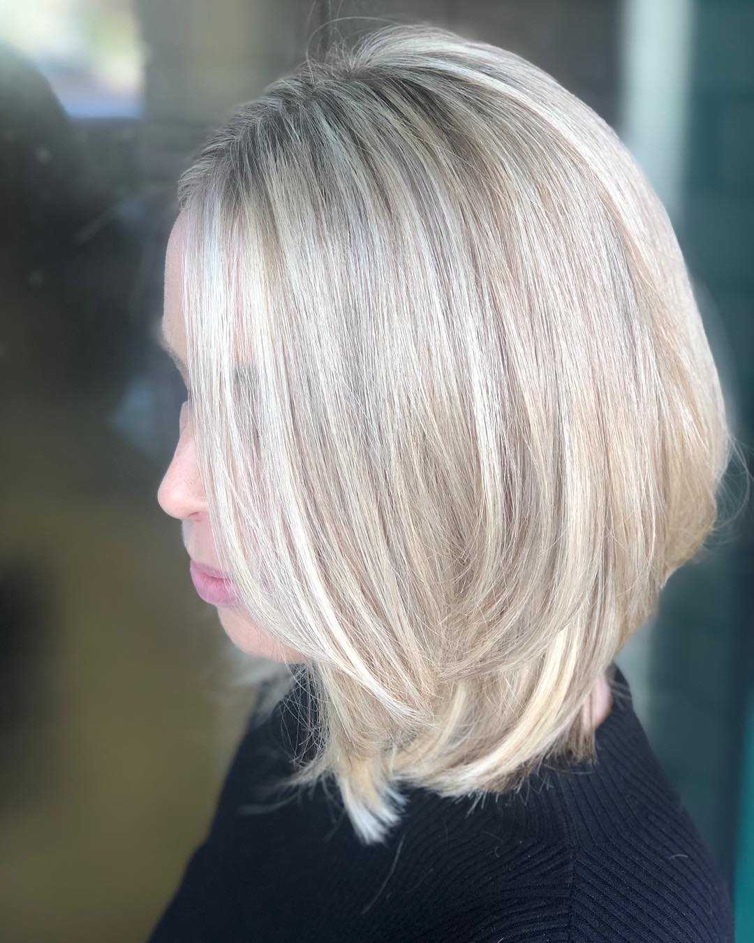 Правильный цвет окрашивания будет хорошим способом выглядеть моложе, в том числе и за счет маскировки седых волос. Отдавайте предпочтение светлому цвету, который смягчит черты лица, но избегайте слишком выраженного осветления, идеально подходит цвет теплый блондин.