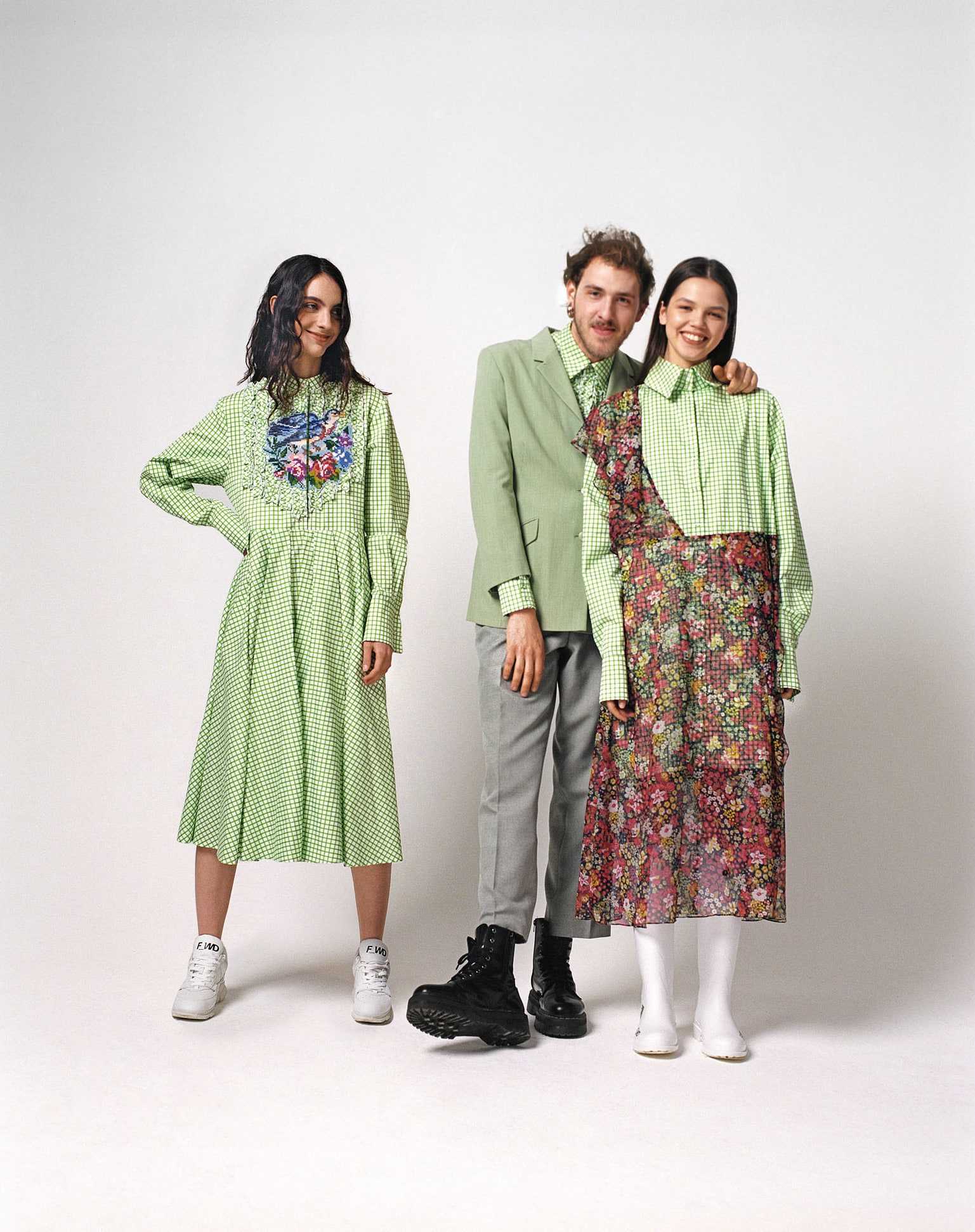 На Романе: костюм Romauvarovdesign; ботинки Dr. Martens. На моделях: платья Romauvarovdesign; обувь из переработанного океанического мусора и биоразлагаемого пластика F_WD.