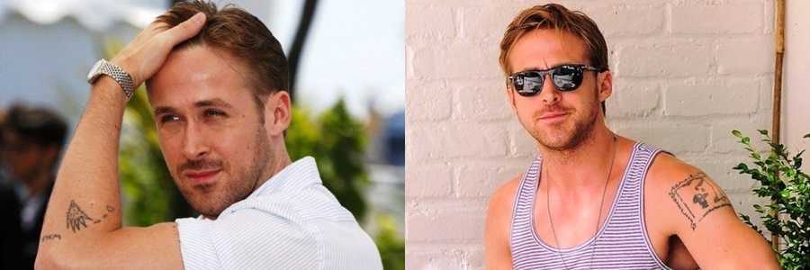 Рядом красуются буквы W. H. R. – сокращение для композиции Werewolf Heart Record из первого альбома музыкальной группы Гослинга. Под часами на запястье скрывается своеобразный «браслетик», который иногда принимают за штрих-код. Самая последняя татуировка звезды на данный момент – имя одной из его дочерей, выколотое на фалангах пальцев левой руки.